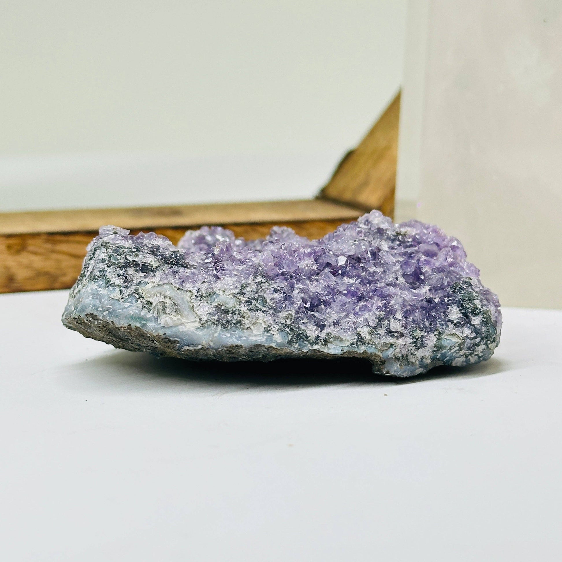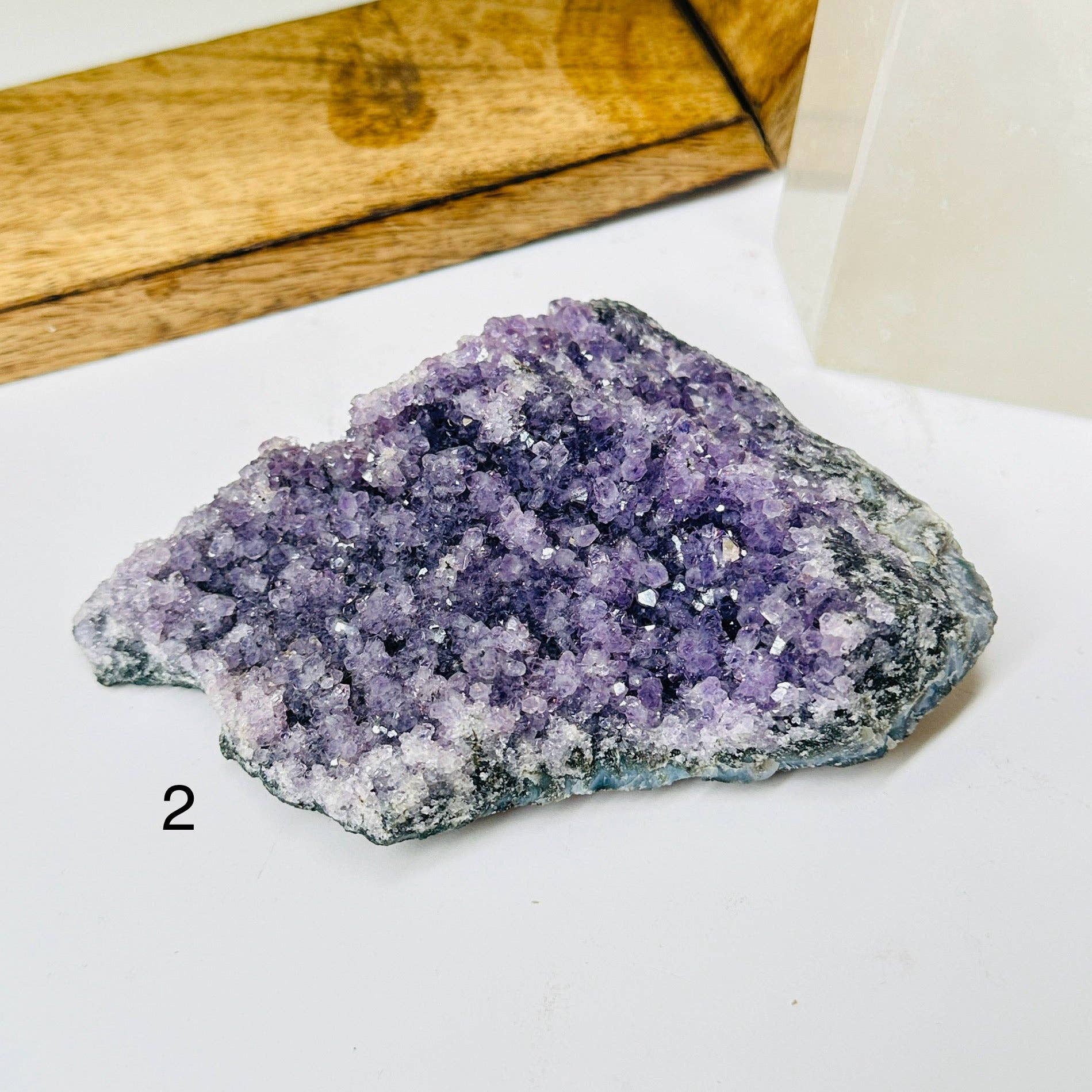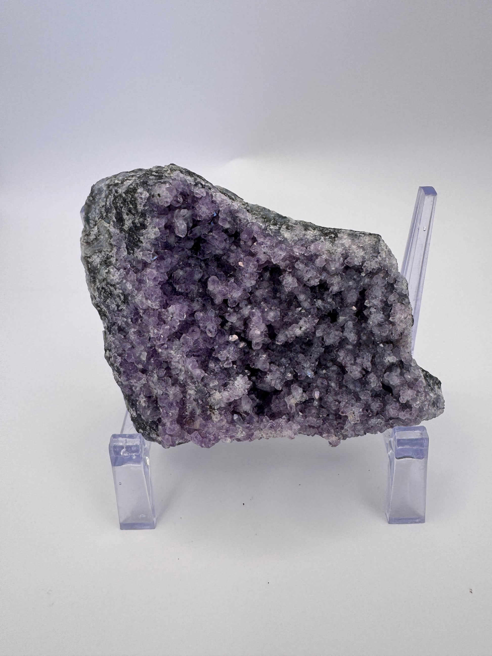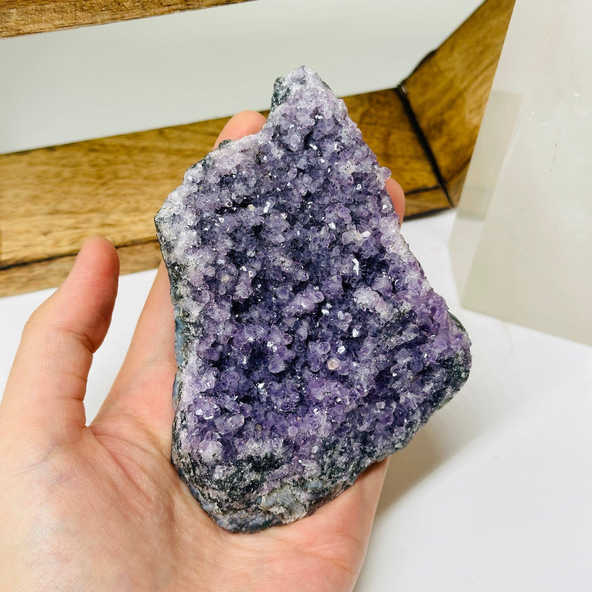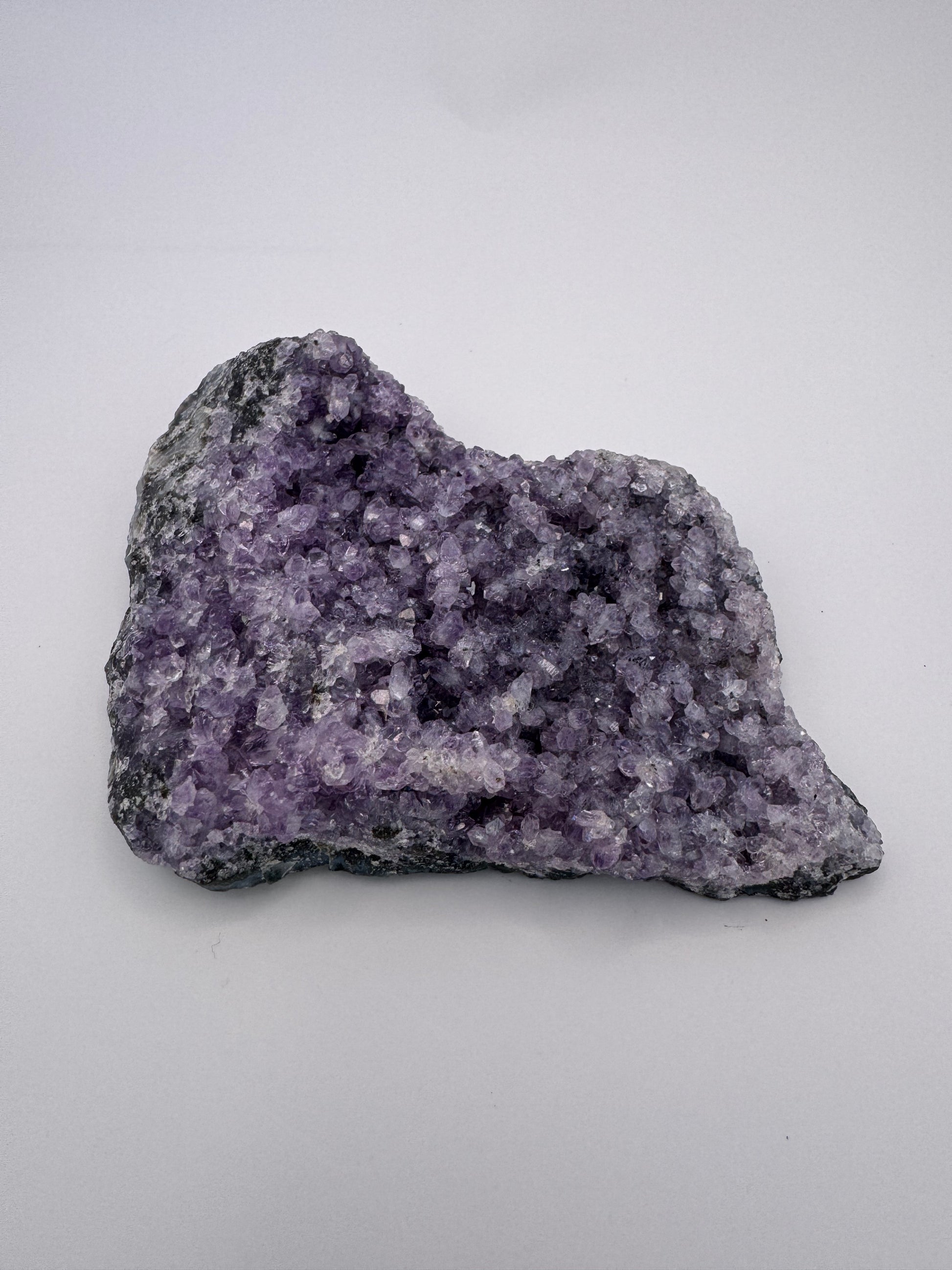 Listing is for ONE (1) Amethyst Crystal Cluster One of a Kind Brighten up your room with this unique amethyst This amethyst crystal cluster will capture everyone's attention. The crystal can help bring positive energy into any room while also being a beautiful decoration. Amethyst: Amethyst's calming properties aid in meditation and emotional stability, enhancing spiritual awareness and intuition for a deeper connection to the self. Why you will love our Amethyst Crystal Cluster: * Beautiful Design: The crystal is striking and unique, capable of catching anyone's attention. * Positive Energy: Amethyst is believed to be a calming stone that can bring positivity and stability to the owner's life. You will receive this exact specimen. Approx 3.75 by 3.25