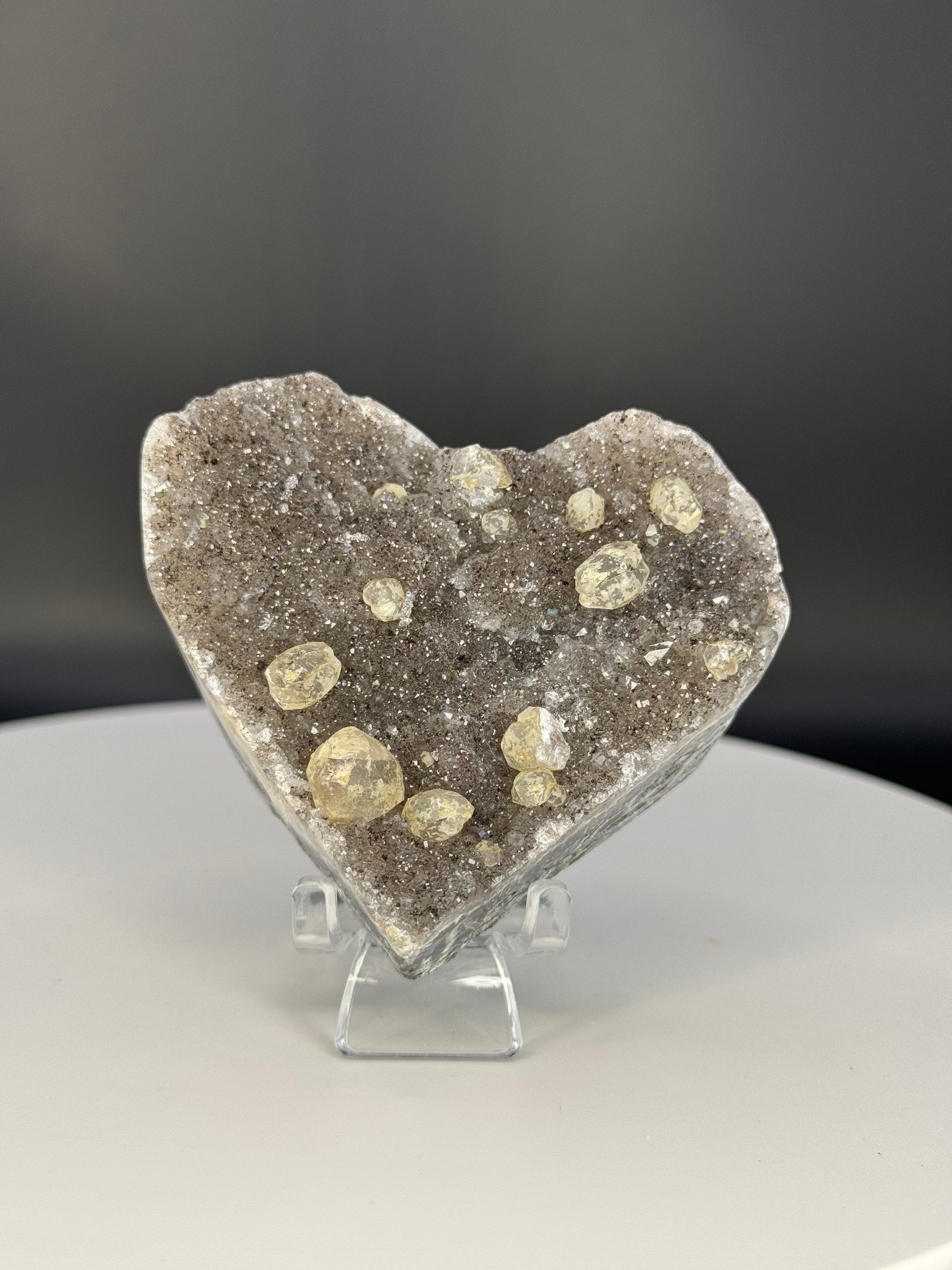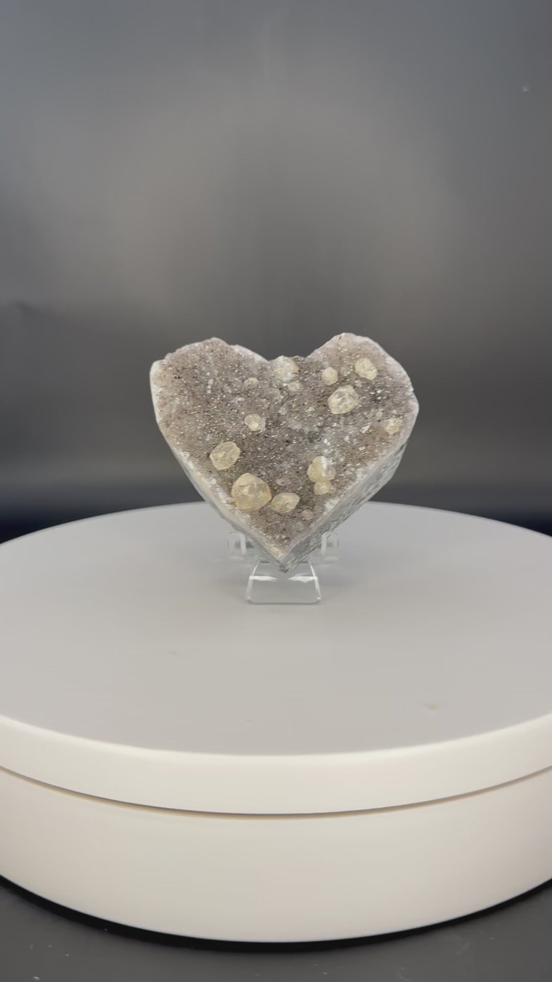 Discover the mesmerizing beauty of our Amethyst Heart with Calcite from Brazil, featuring stunning UV reactive calcite that transforms under ultraviolet light. This unique crystal combination not only serves as a striking decorative piece but also harnesses the calming properties of amethyst with the energizing effects of calcite. Add this rare geological treasure to your collection and experience its dual nature—beautiful in daylight, absolutely spectacular under UV light.