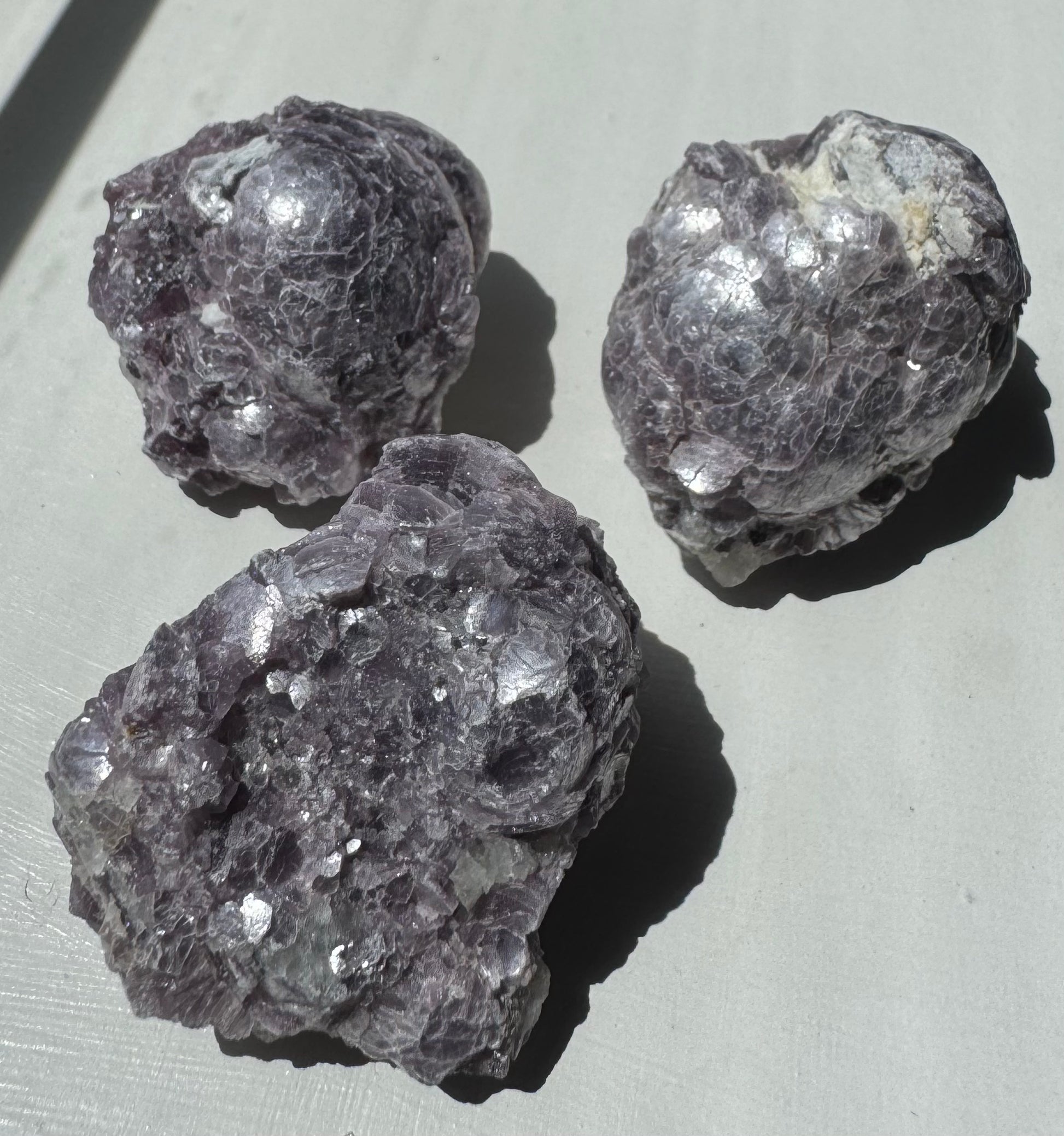 Raw lepidolite with rare botryoidal (bubble-like) formations showcases beautiful lavender hues with a shine from the mica present. Lepidolite occurs as lithium-rich mica deposits. Add one today to your crystal and stone collection! Use it as decoration, for healing, or gift it to a special person. Why You'll Love It: * Natural Formation: Rare botryoidal lepidolite naturally contains the lithium used to power batteries, phones, cars, etc. * Bubble Texture: Its bubble texture is very pleasing to the eye! * Beautiful Color: This shade of lilac is highly sought after by collectors. Product Details: * Content: these 3 Botryoidal Lepidolite Crystal Clusters.