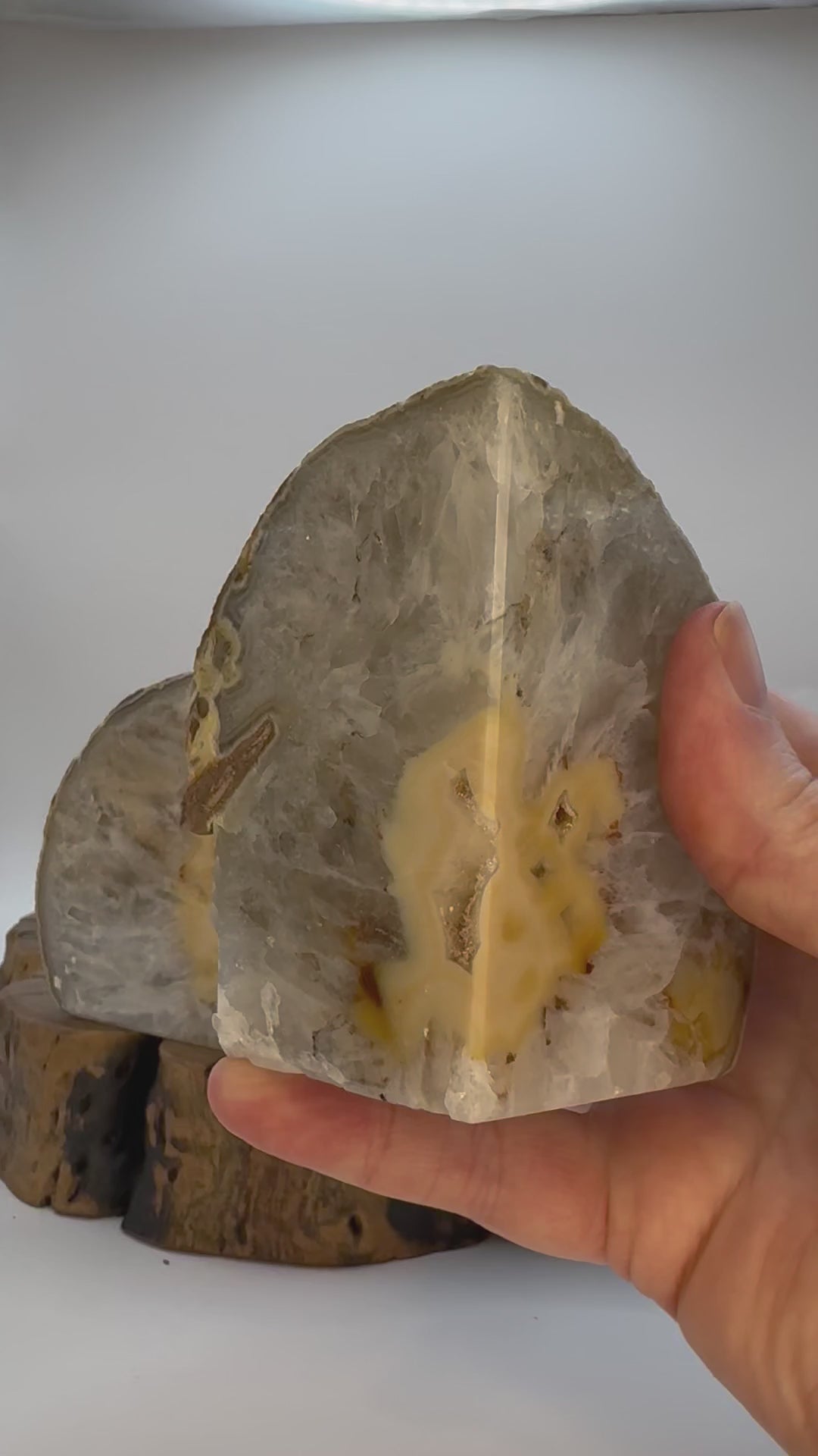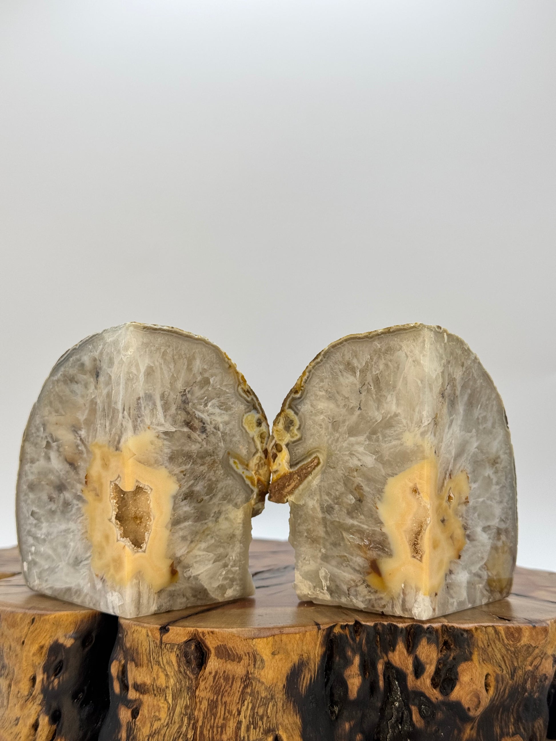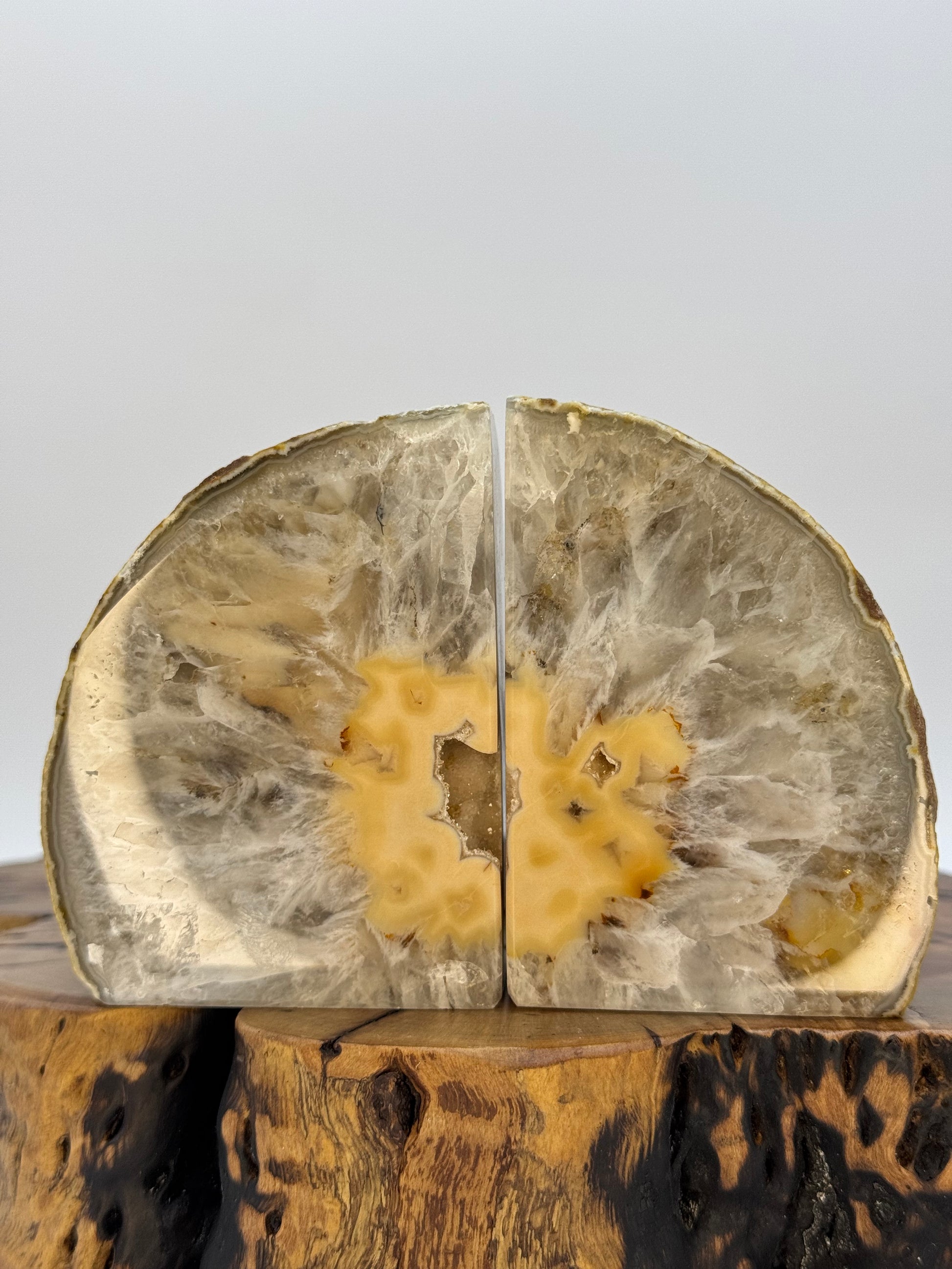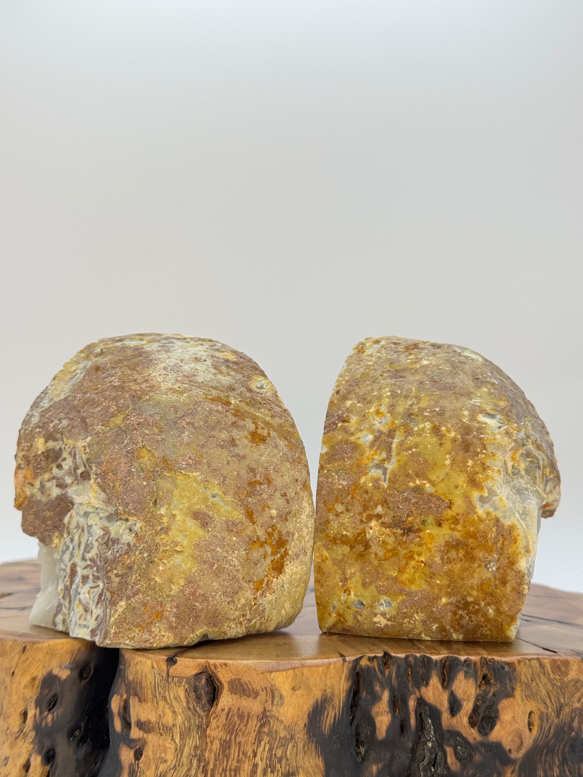 Add a touch of sophistication to your bookshelf with our Brazilian Agate Bookends with Druzy. These luxurious bookends feature stunning Brazilian Agate with sparkling druzy inclusions, elevating any space with their natural beauty. A must-have for any book lover or home decorator looking for unique and elegant pieces.