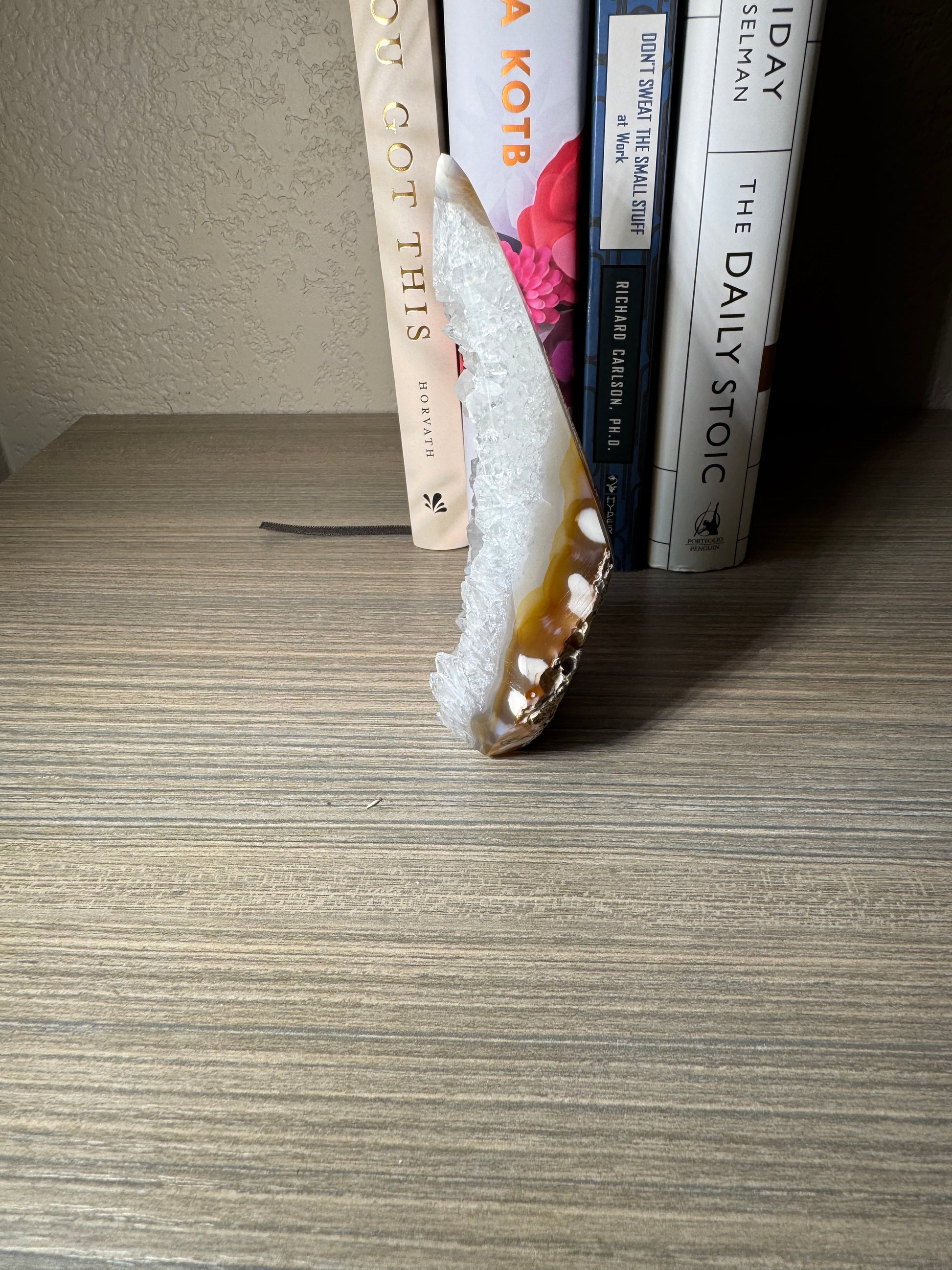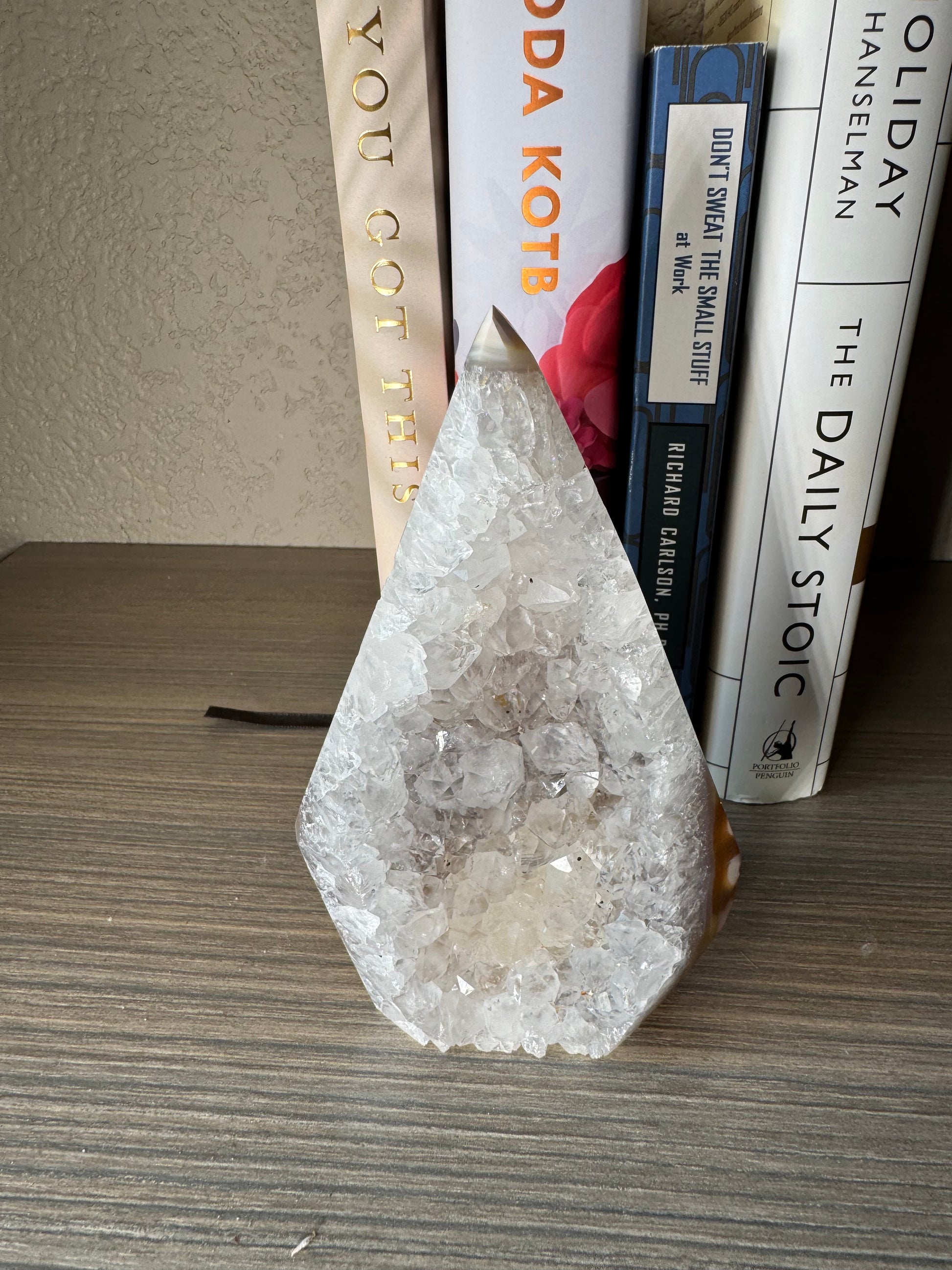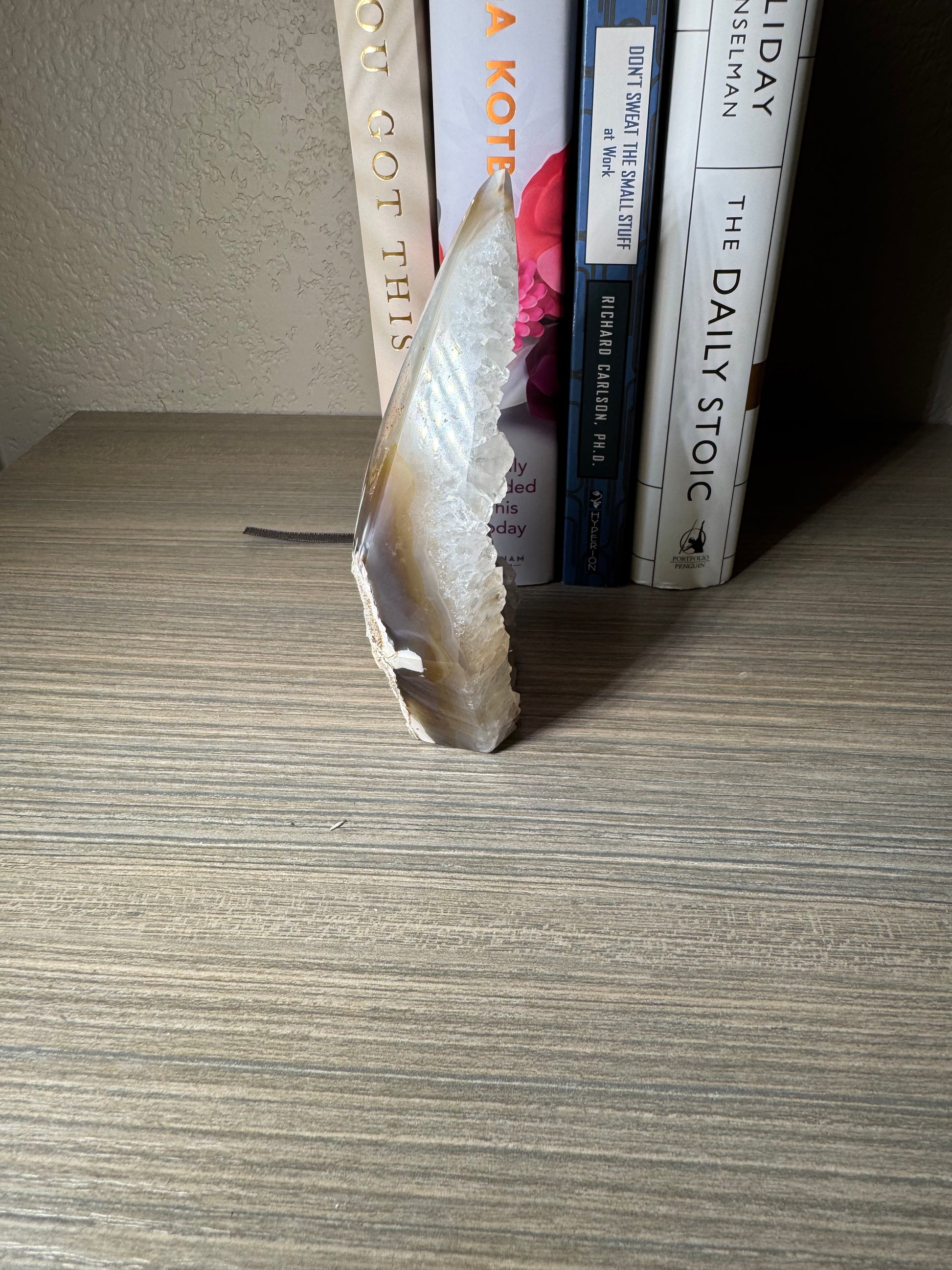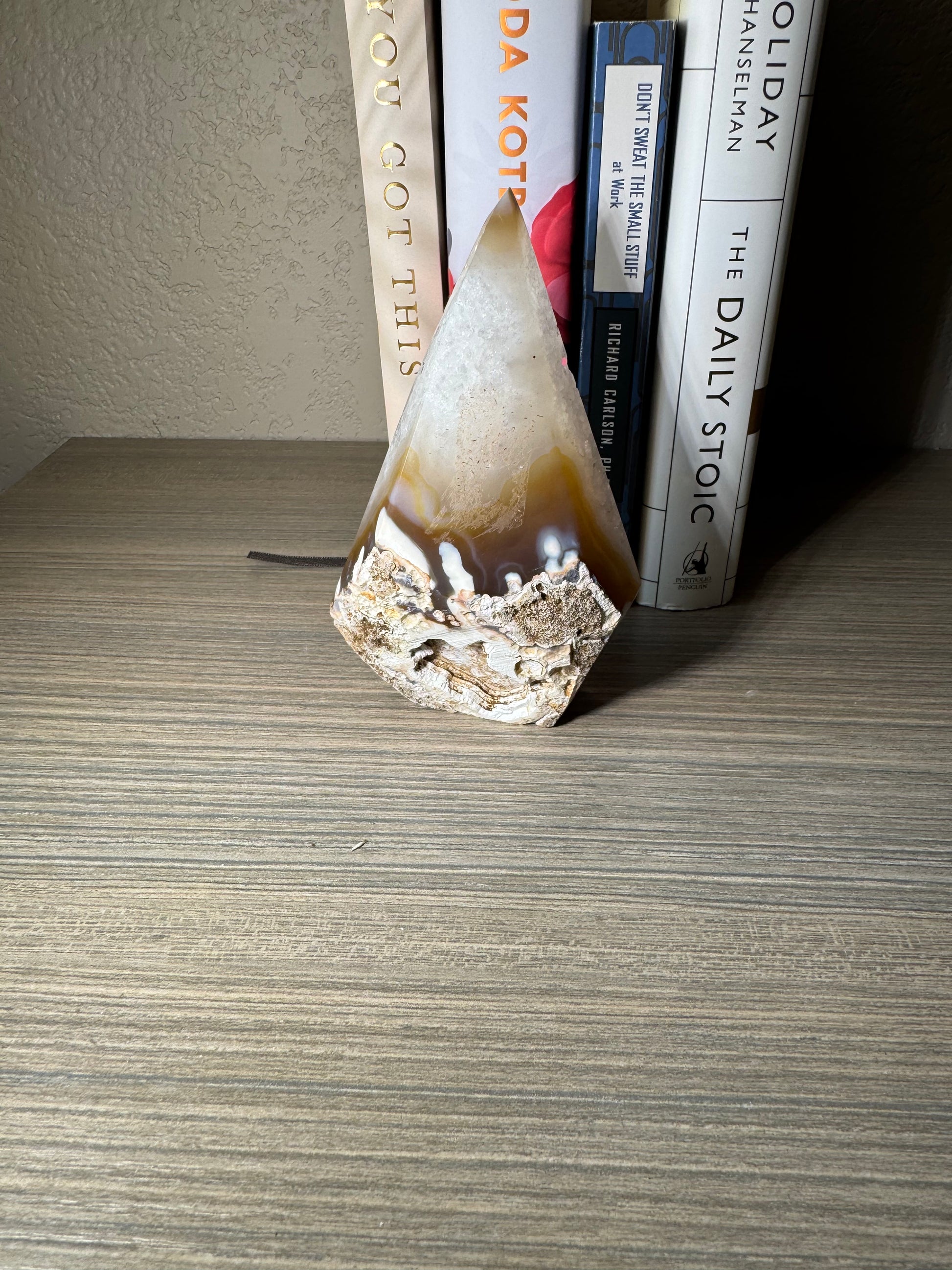 The Brazilian Agate Freeform features a beautifully polished side, while retaining a natural, unpolished back for an authentic touch. This unique combination showcases the stone’s raw beauty and craftsmanship, making it an eye-catching piece for collectors or home décor. Add a natural elegance and distinctive charm to your space with this exceptional gemstone.
