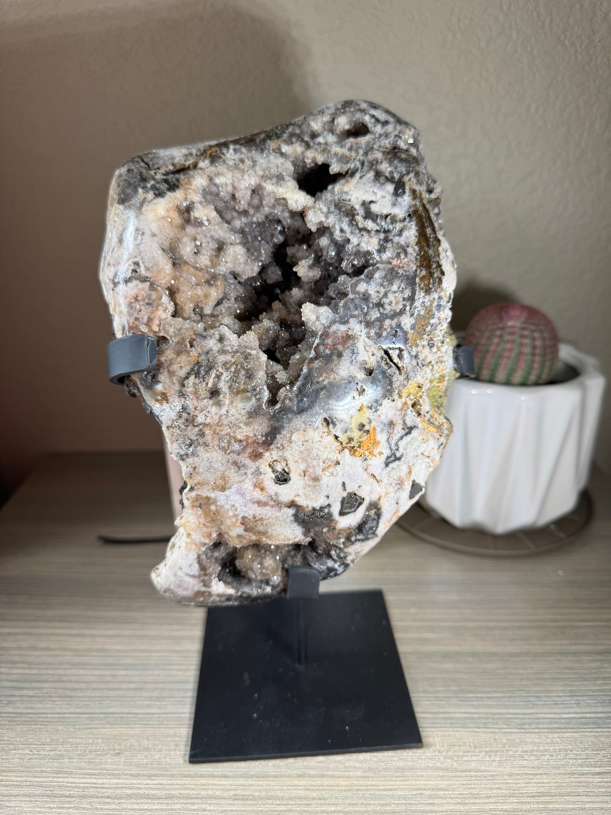Elevate your space with the captivating beauty of this Brazilian Agate Geode, showcased on a custom stand designed to highlight its natural patterns and vibrant colors. Each piece is unique, bringing a touch of elegance and earthy charm to your home or office. Perfect as a statement decor item or a thoughtful gift, this agate combines natural artistry with refined presentation to inspire and impress.