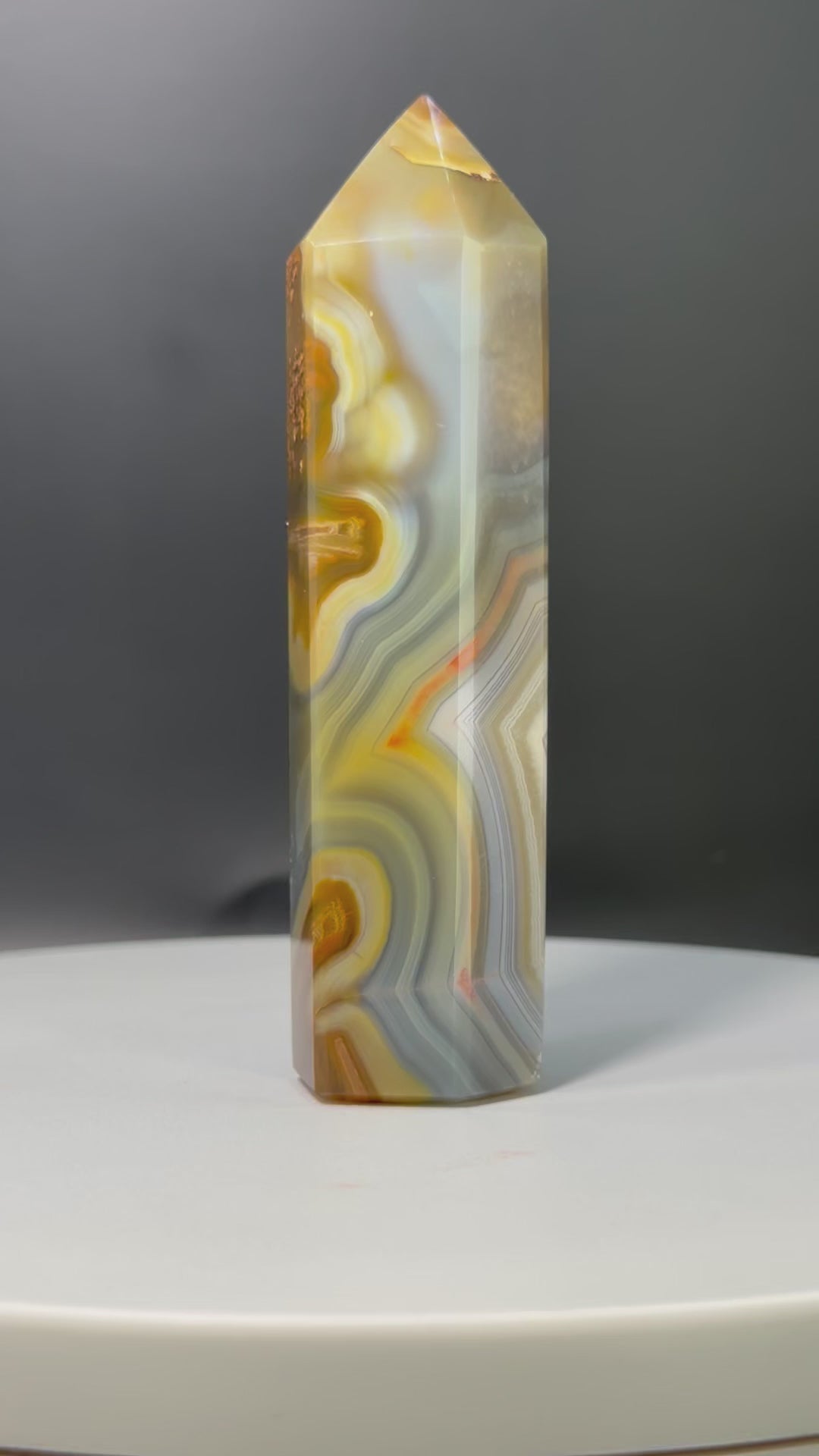 Elevate your home decor with the luxurious Brazilian Sagenite Agate Tower. This stunning piece features intricate banding that adds depth and character, making it a unique and sophisticated addition to any space. Immerse yourself in the world of refinement with this exclusive and elegant tower.