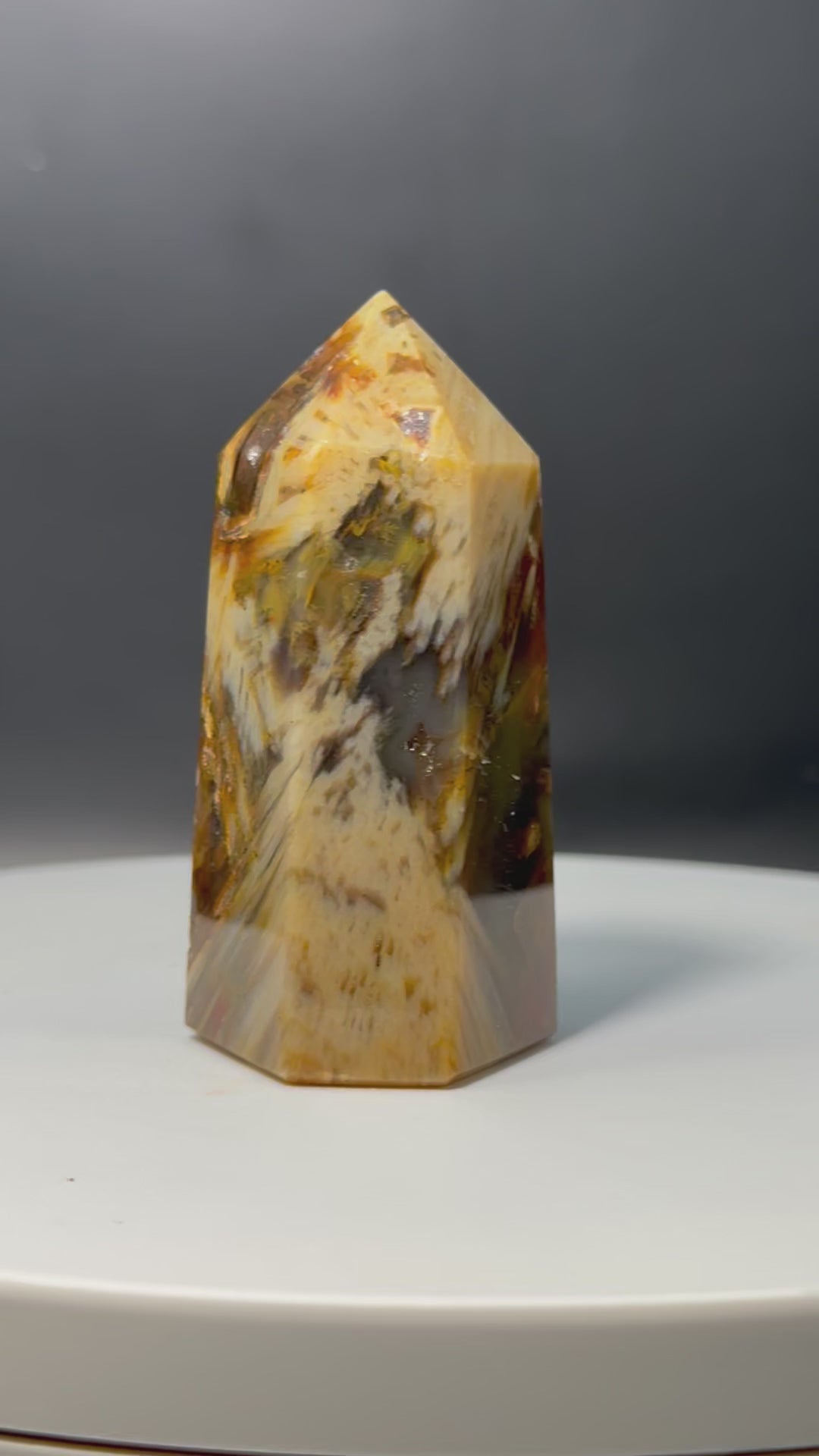 Elevate your home decor with the luxurious Brazilian Sagenite Agate Tower. This stunning piece features intricate banding that adds depth and character, making it a unique and sophisticated addition to any space. Immerse yourself in the world of refinement with this exclusive and elegant tower.