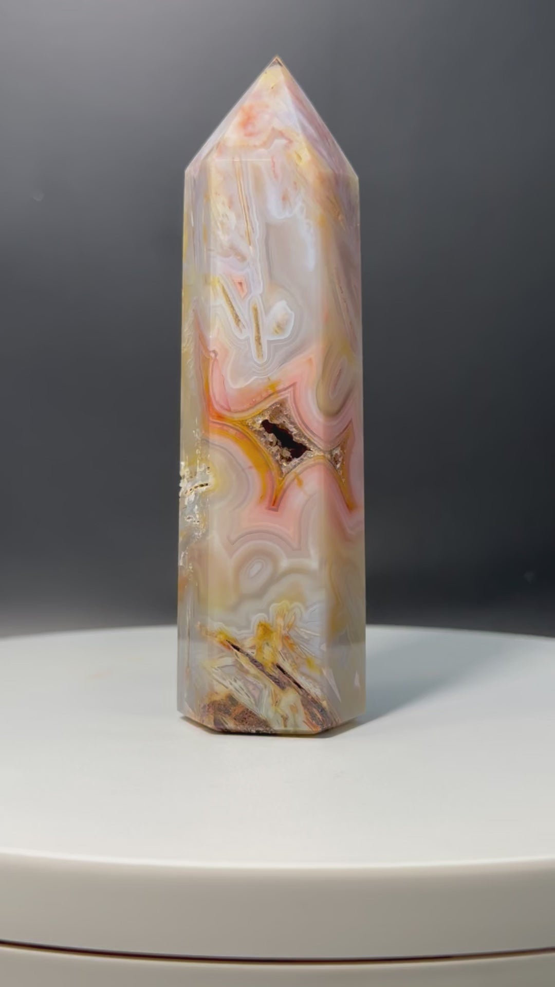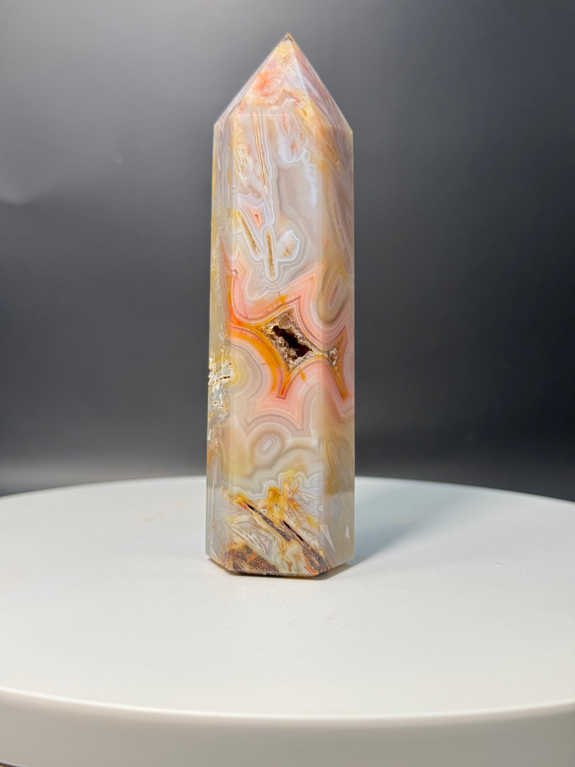 Elevate your home decor with the luxurious Brazilian Sagenite Agate Tower. This stunning piece features intricate banding that adds depth and character, making it a unique and sophisticated addition to any space. Immerse yourself in the world of refinement with this exclusive and elegant tower.