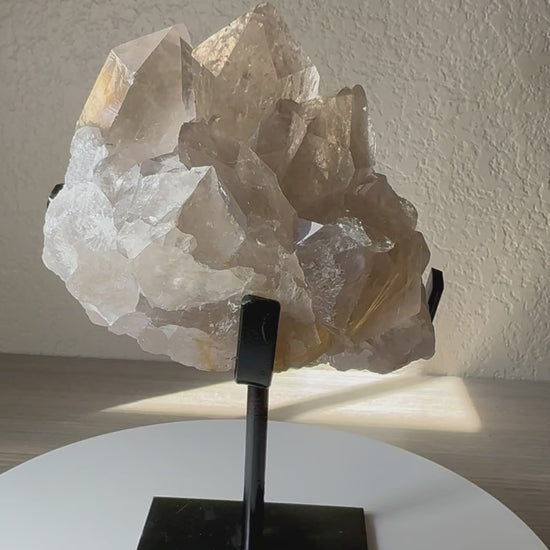 Elevate your space with this stunning Clear Quartz Cluster adorned with shimmering golden rutiles, sourced directly from Brazil. Each unique cluster radiates natural energy and beauty, enhanced by a custom stand that showcases its brilliance. Perfect for adding a touch of elegance and positive vibes to any room, this piece combines nature’s artistry with refined craftsmanship. Embrace the power and allure of this exquisite crystal cluster to inspire clarity and warmth in your environment.
