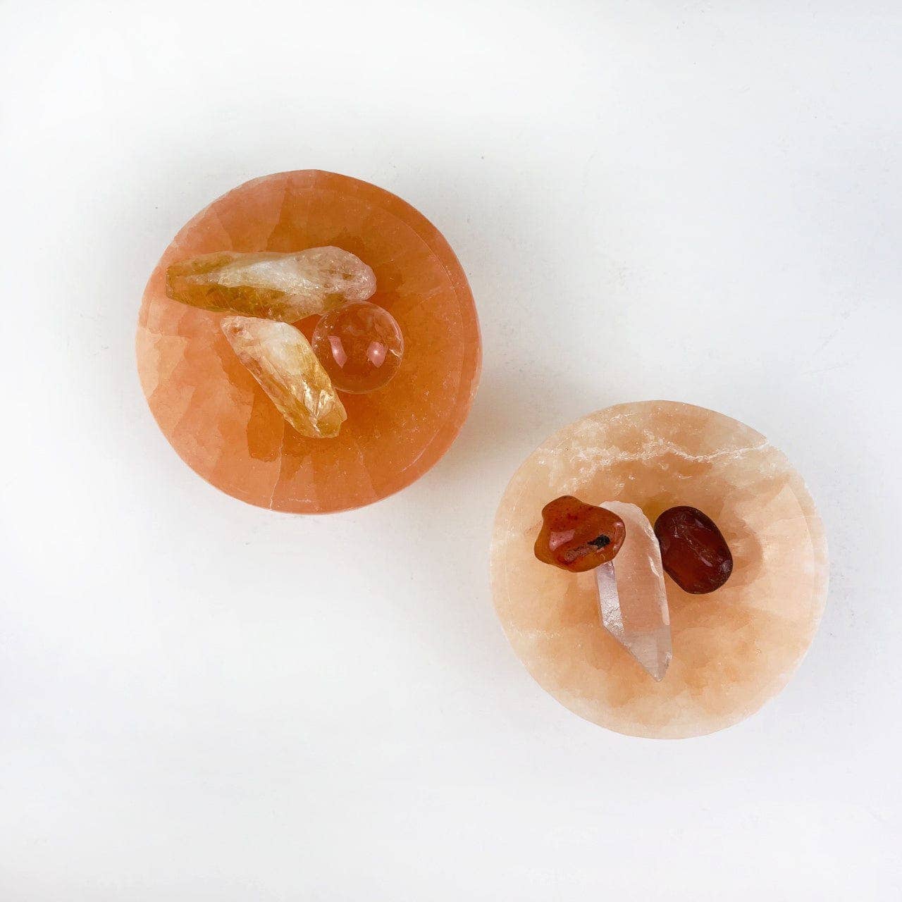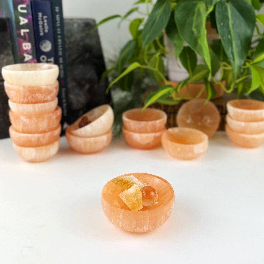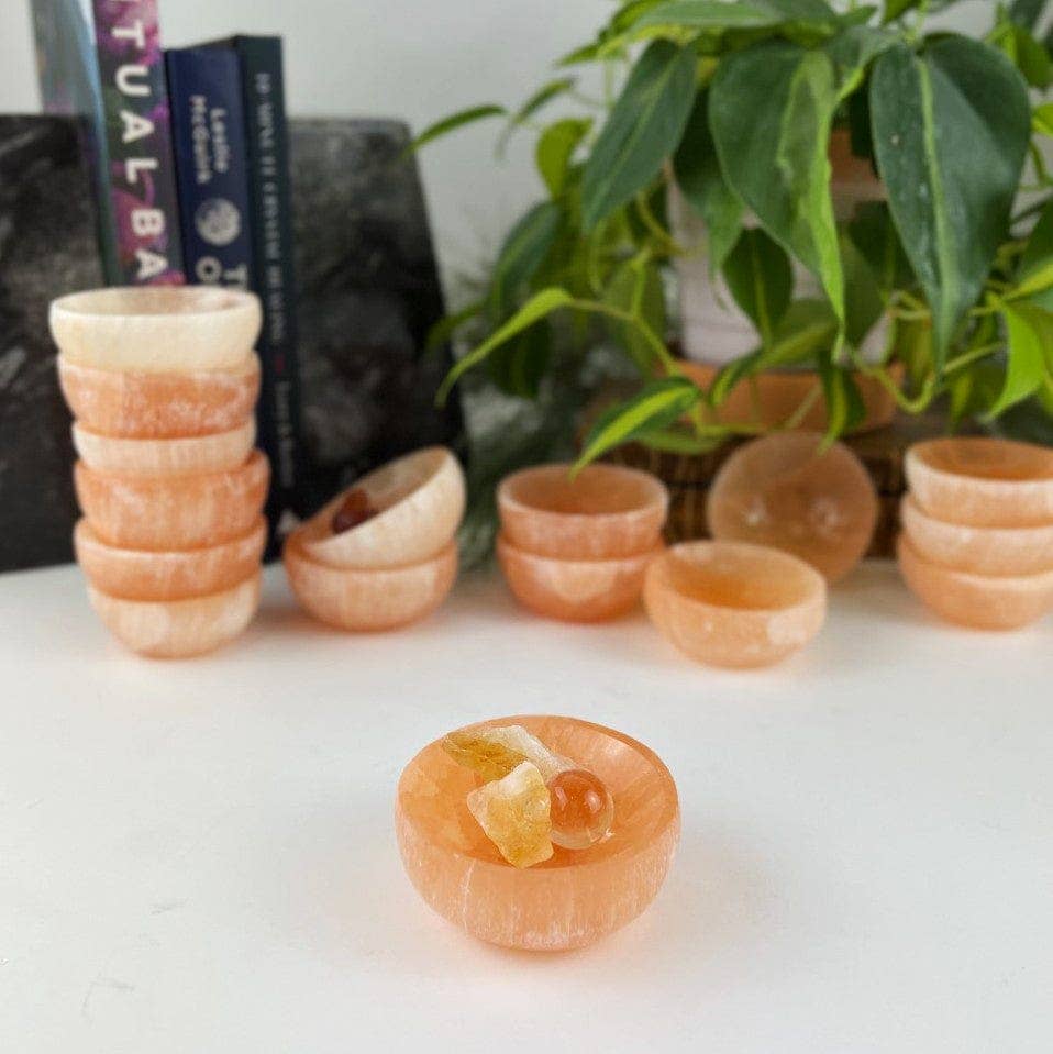 Crystal This listing is for ONE (1) Orange Selenite Bowl. These Orange Selenite bowls are a must have! They can be added to any tabletop and used for holding jewelry, rings, or pocket stones. Add one of these to your collection or use as home decor. Approx. Measure: 2.5 x 1.5 inches. Selenite is the stone of “MENTAL CLARITY”. It enhances mental flexibility and enables strong decision-making. Selenite removes energy blocks and clears the way for better intuition, psychic awareness, and spiritual development. < Crown Chakra > < Third Eye Chakra >