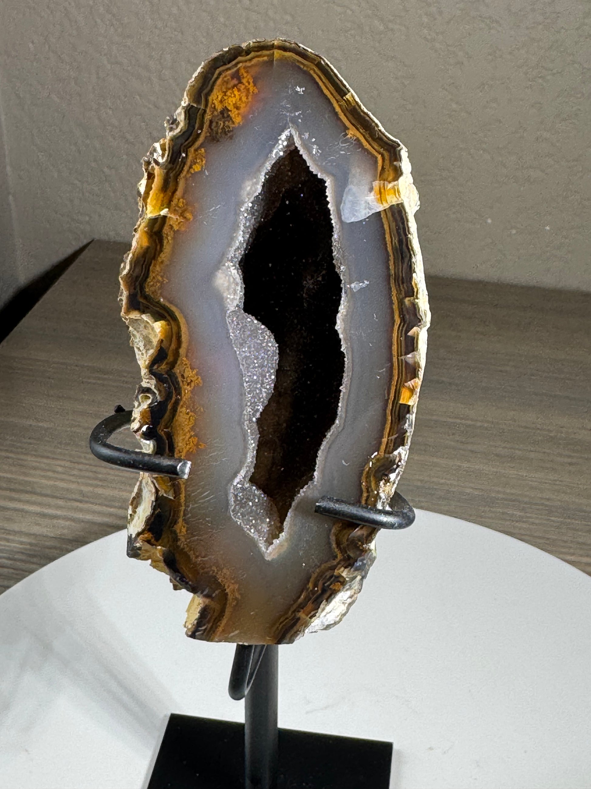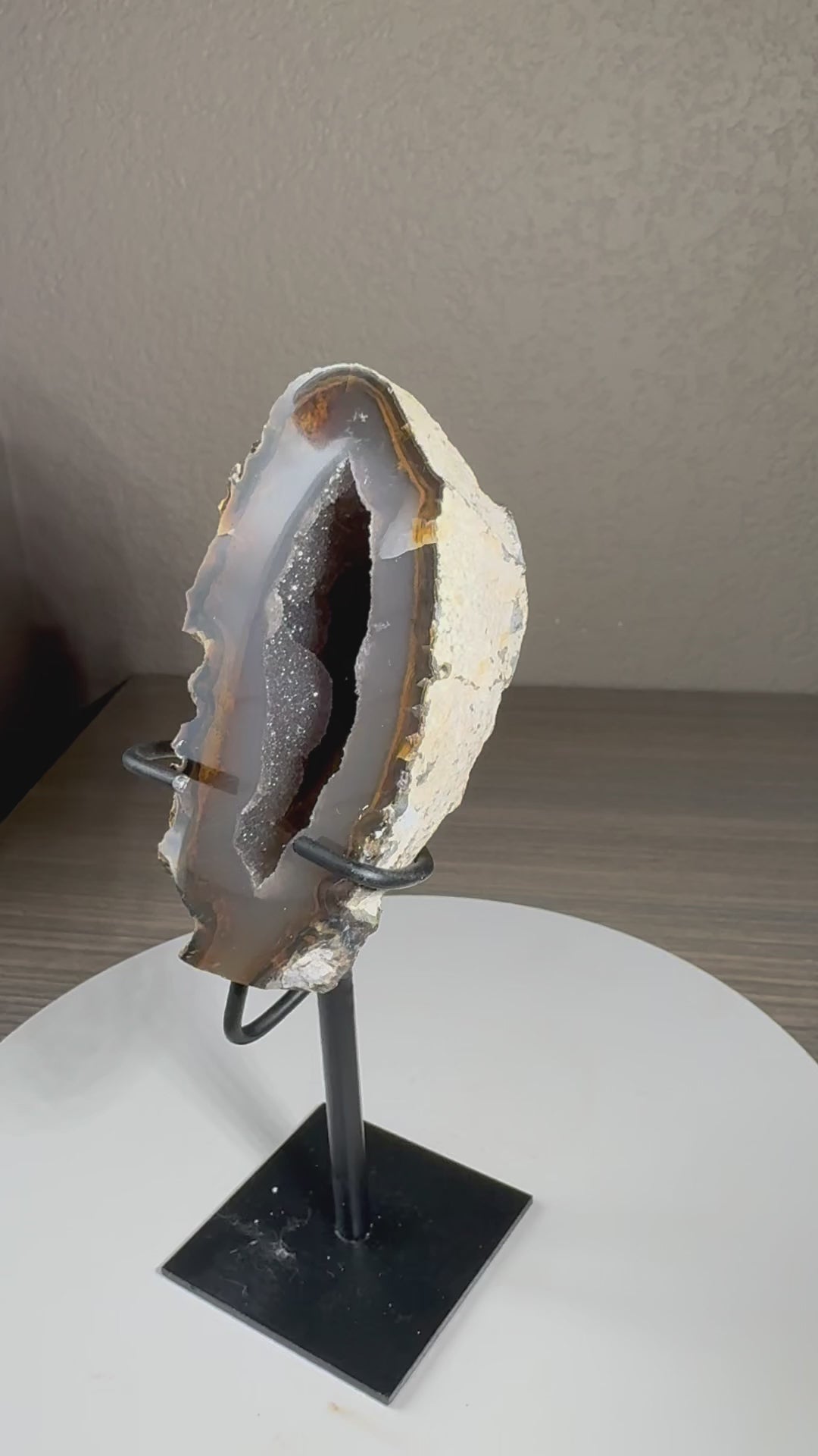 Discover the captivating beauty of the Brazilian Geode with a custom stand, perfect for adding a unique and natural touch to your space. Each geode showcases stunning crystal formations that catch the light, creating a mesmerizing display. The custom stand enhances its elegance while providing a stable and stylish base, making it an ideal centerpiece for your home or office. Elevate your décor with this exquisite natural treasure that combines art and nature effortlessly.