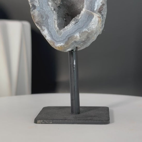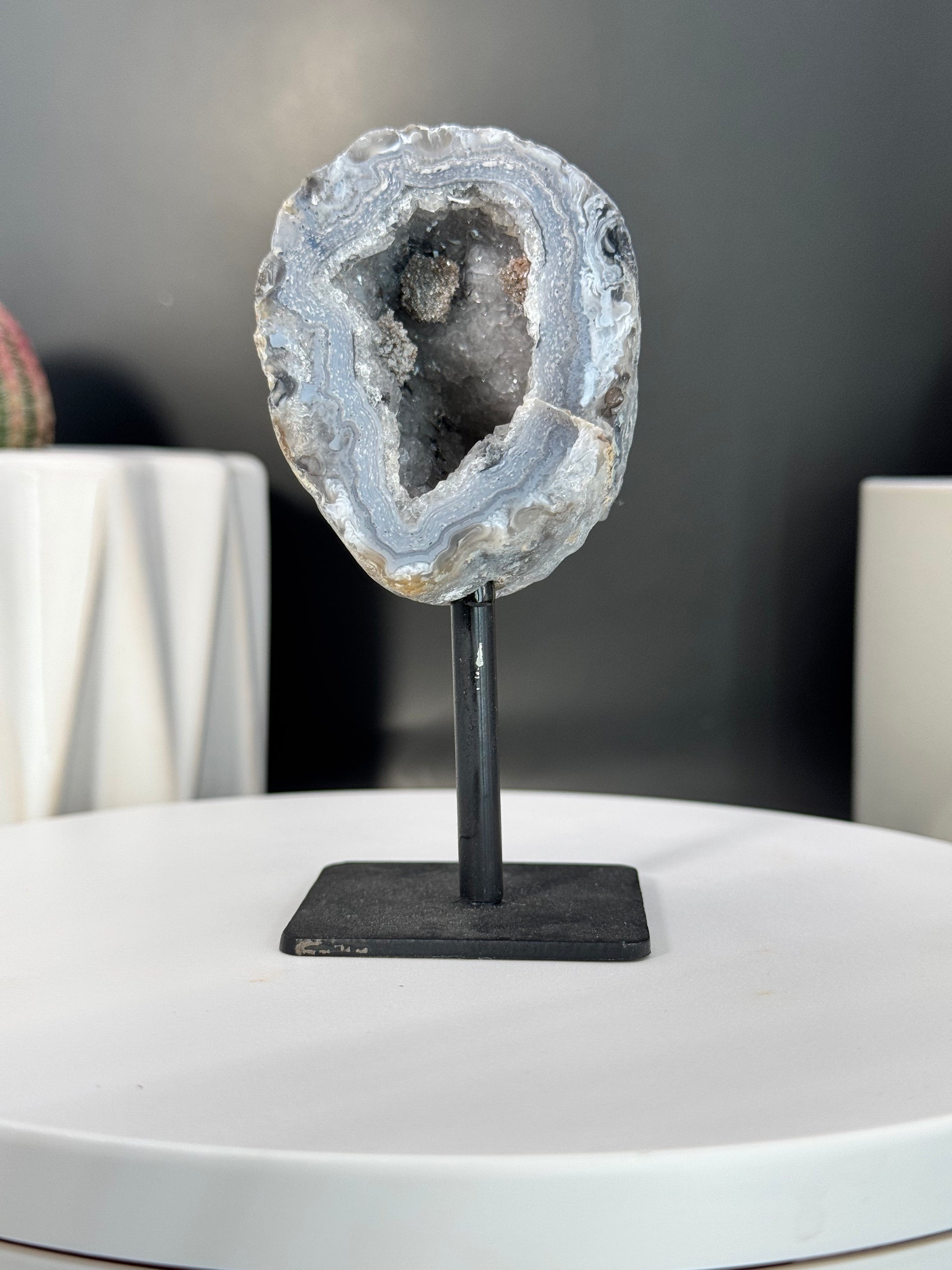 This Geode On Stand is a stunning piece that marries the natural beauty of banding and crystals with the sophistication of a sleek stand. Perfect for adding a touch of elegance to any room, this unique item will be a conversation starter and a beautiful addition to any decor.