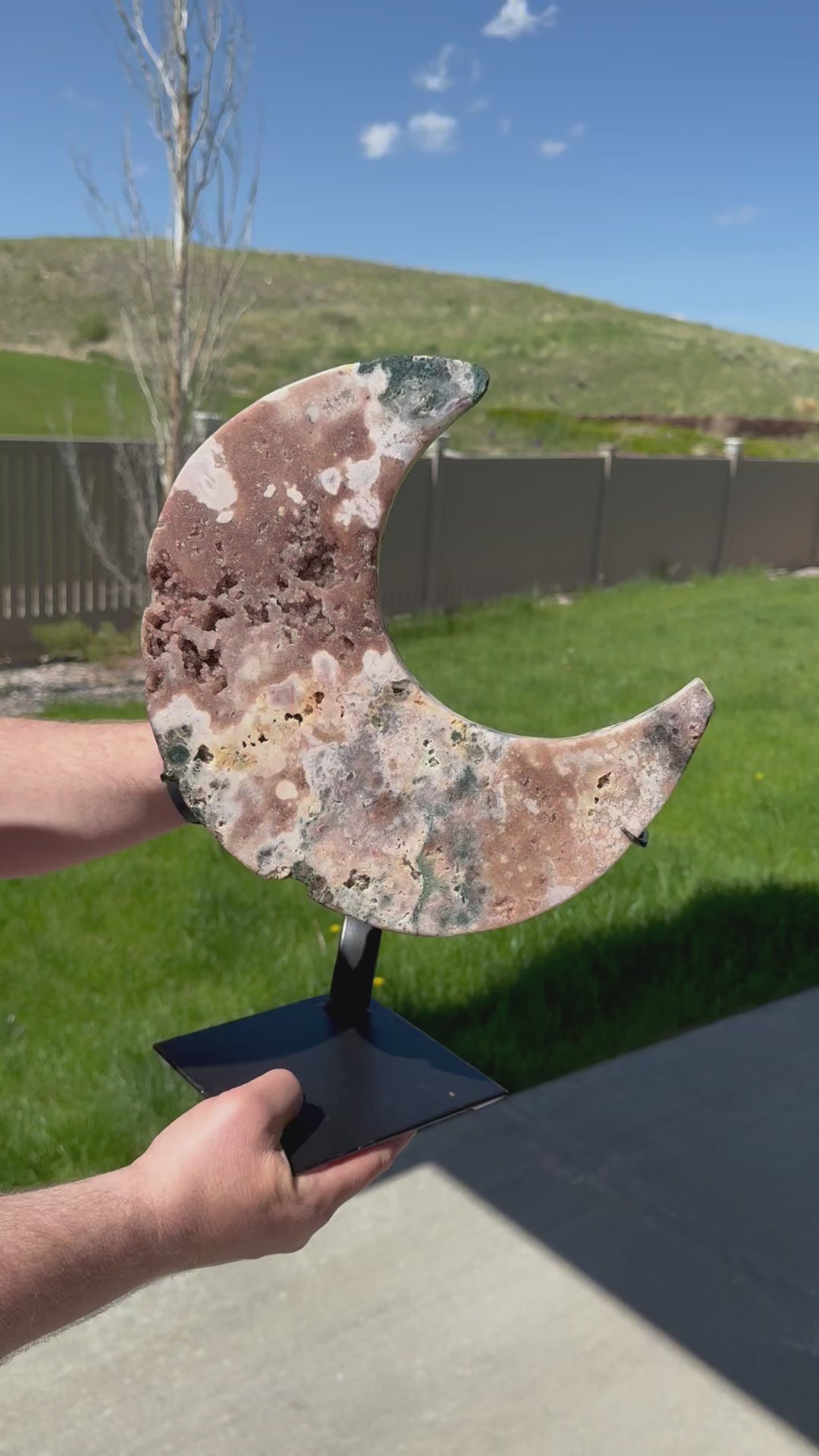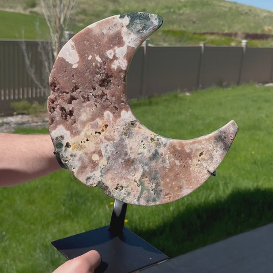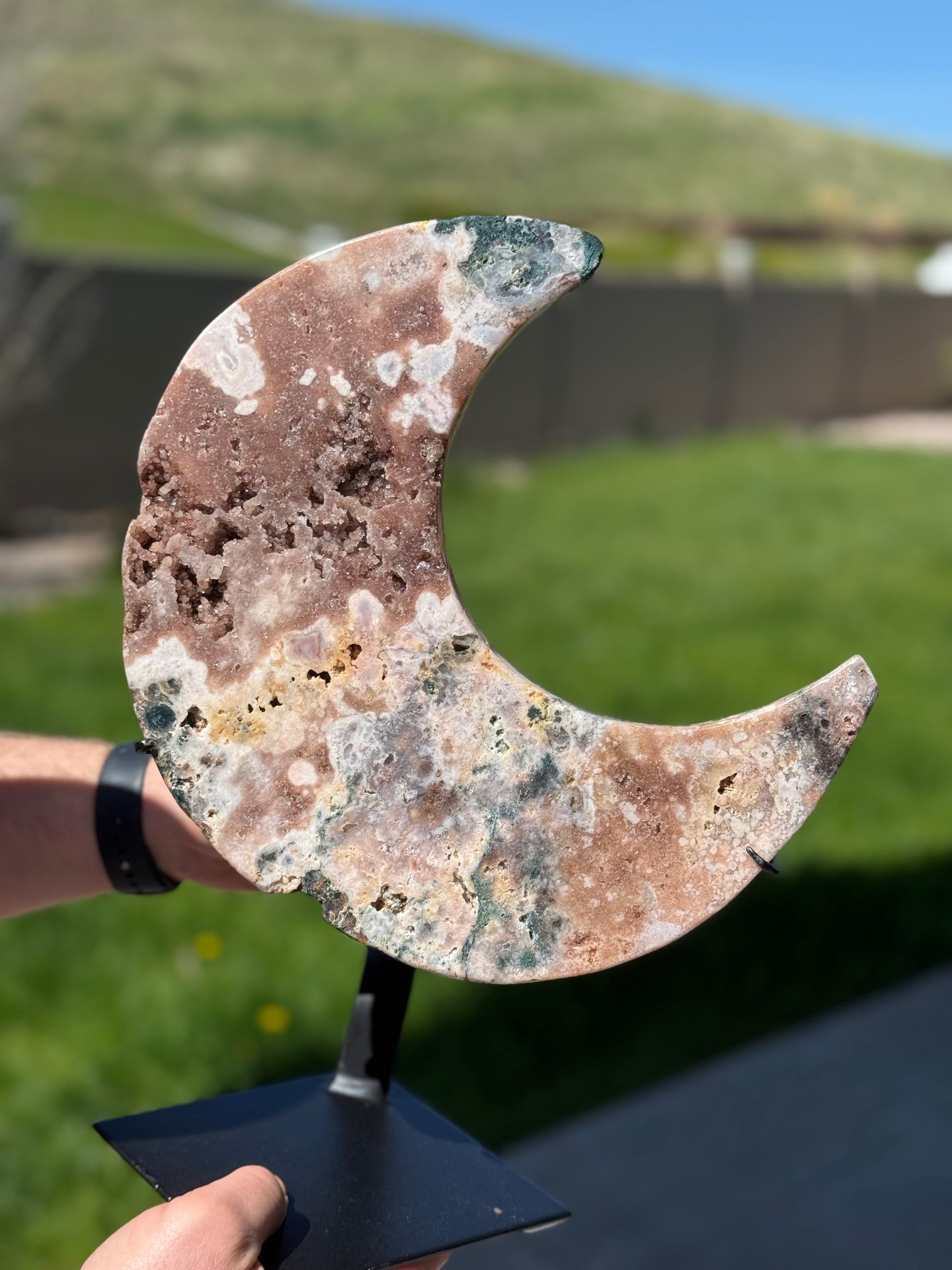 Huge Pink Amethyst Moon on Custom Stand from Brazil