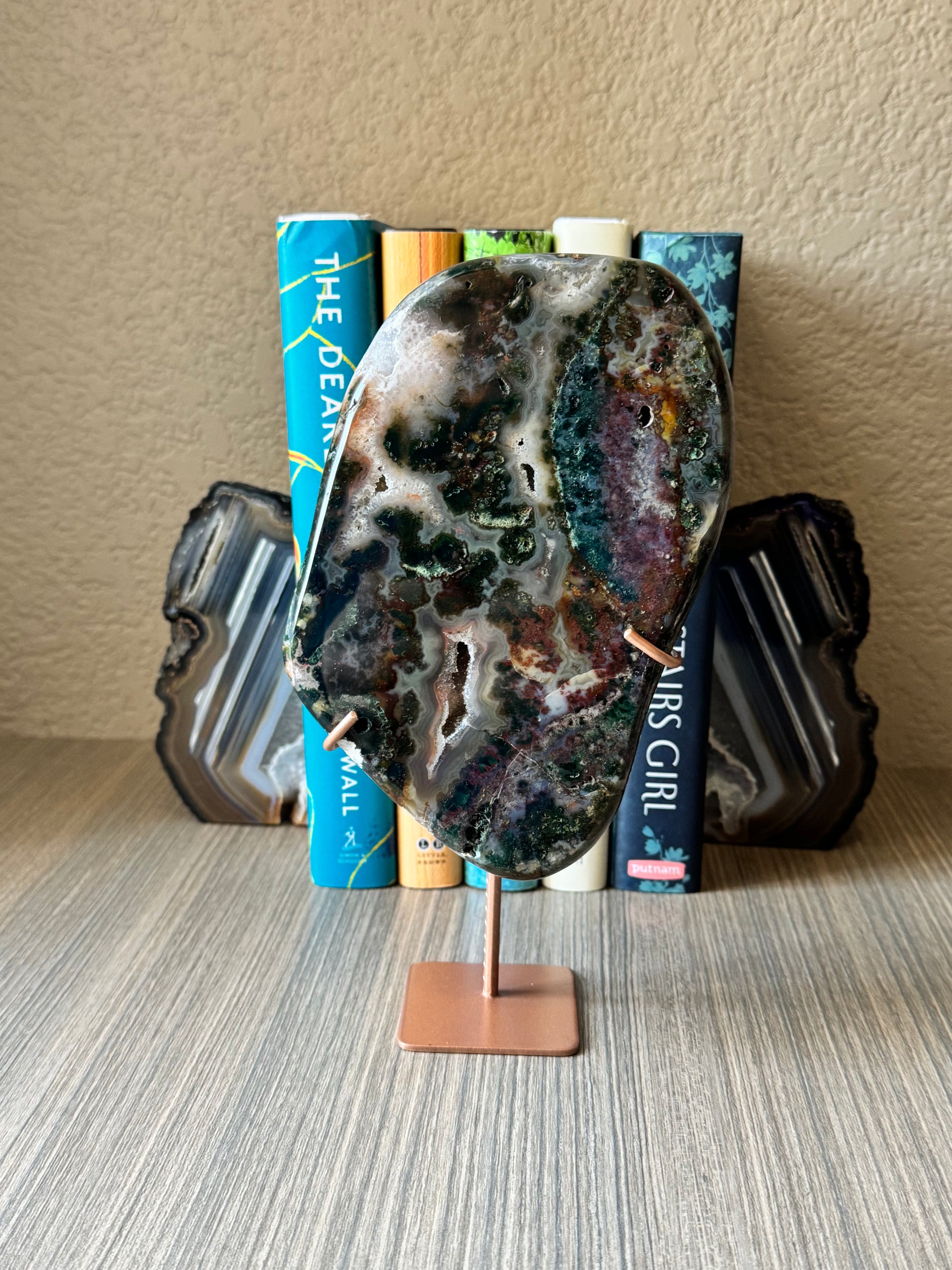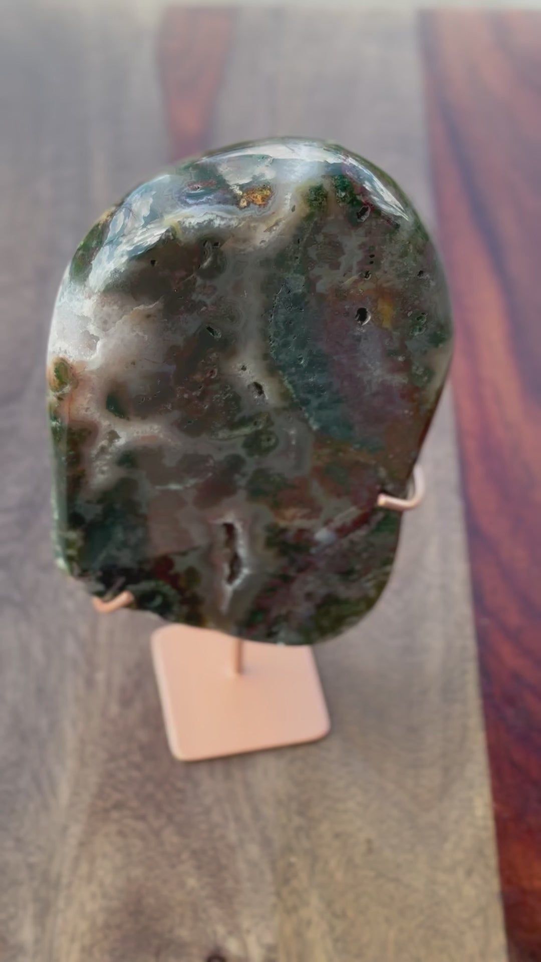 Introducing our Jasper Druzy Freeform from Brazil, featuring a stunning mossy hue. Sourced from the prestigious mines of Brazil, this one-of-a-kind piece exudes elegance and sophistication. Own a piece of art from nature and elevate your style with this exclusive gemstone. Stand included.