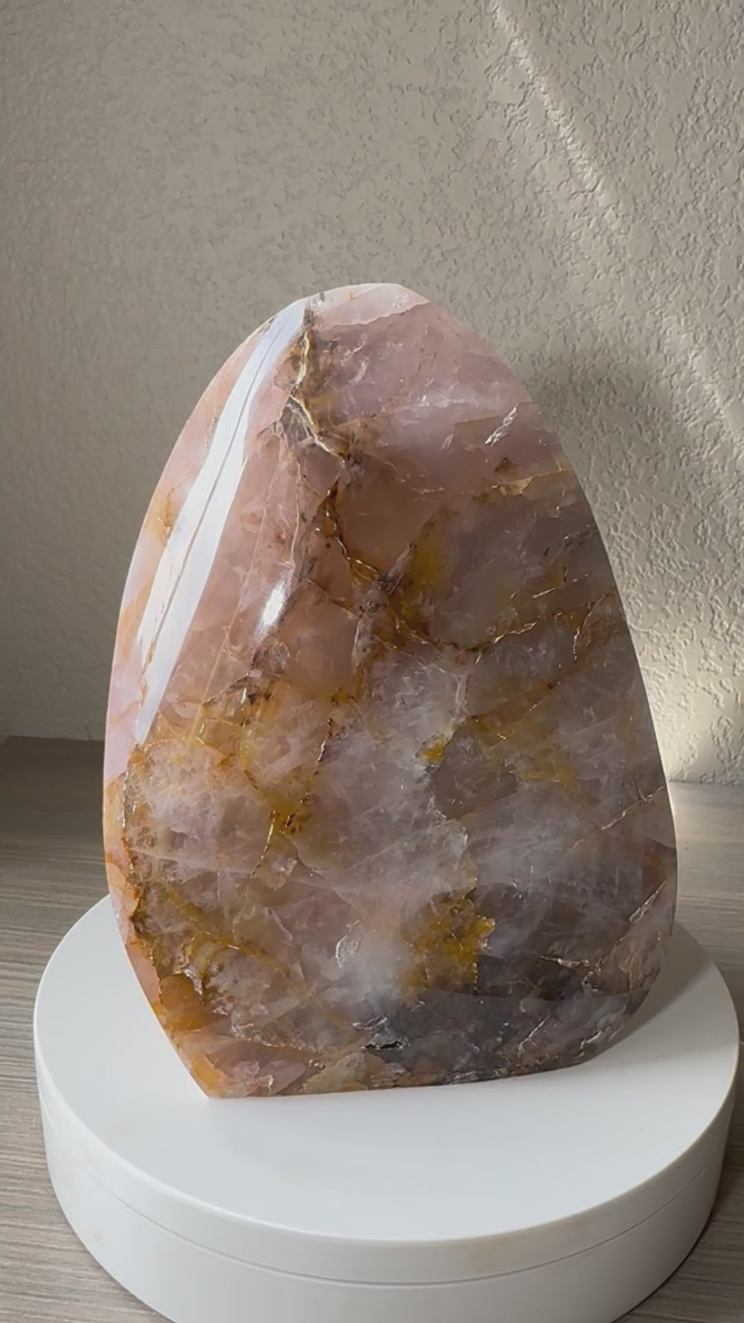 Discover the captivating beauty of this Large Golden Healer Rose Quartz Freeform, weighing 7 lbs and sourced directly from Brazil. Its warm golden hues combined with the gentle pink tones of rose quartz create a stunning natural piece that enhances any space. Perfect for crystal enthusiasts and collectors, this freeform stone promotes emotional healing and positive energy, making it a meaningful addition to your home or office. Elevate your environment with this unique, powerful crystal today.