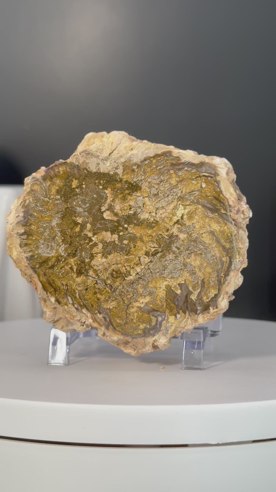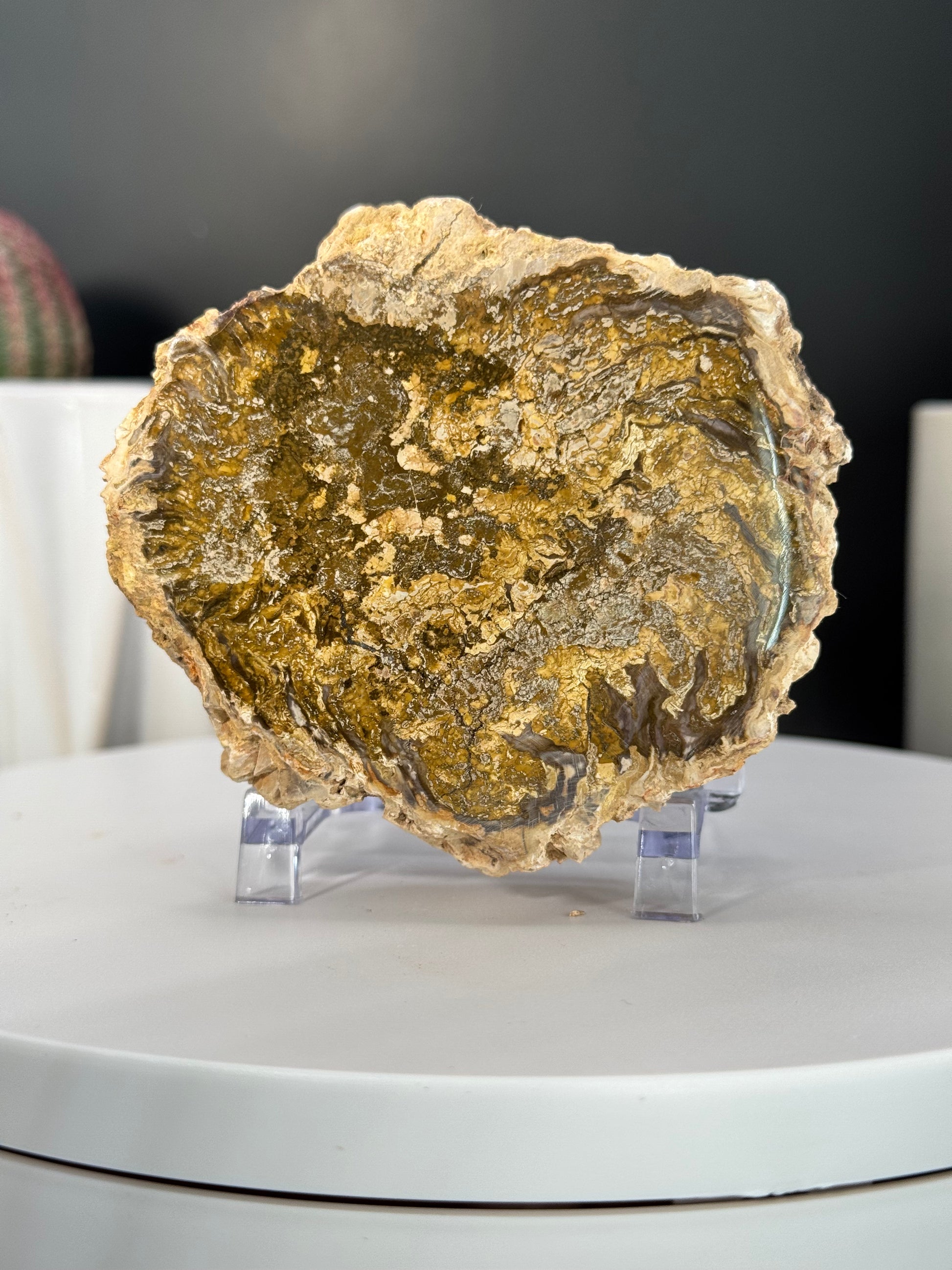 Madagascar Petrified Wood is an exotic and one-of-a-kind piece of nature. This stunning piece has been transformed into a beautiful, polished work of art. It's perfect for adding a touch of sophistication and luxury to any space. Bring the beauty of the outdoors inside with this unique and timeless treasure. Stand not included.