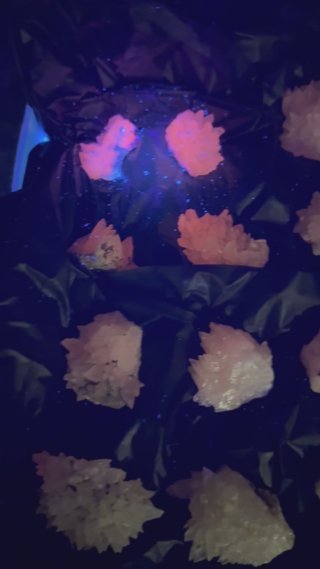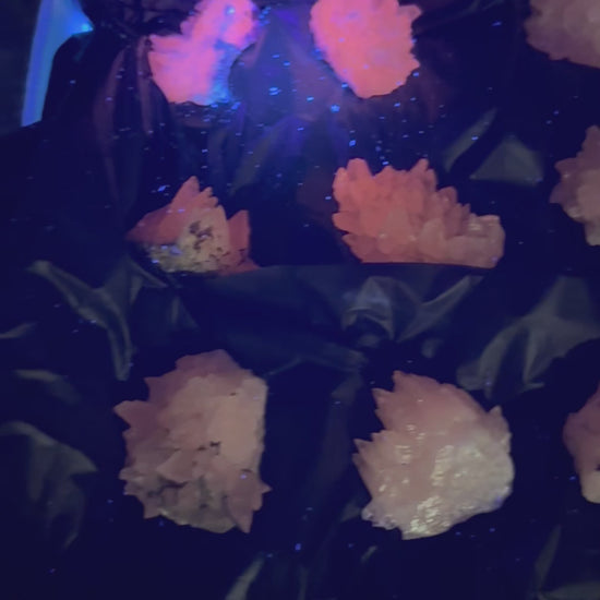 Discover the captivating Mangano Calcite from La Huasca Mine, Michoacan, Mexico. These mineral specimens showcases gentle pink and orange hues under long wave uv, perfect for collectors and crystal enthusiasts. Known for its calming energy, Mangano Calcite can enhance emotional healing and promote a peaceful environment.