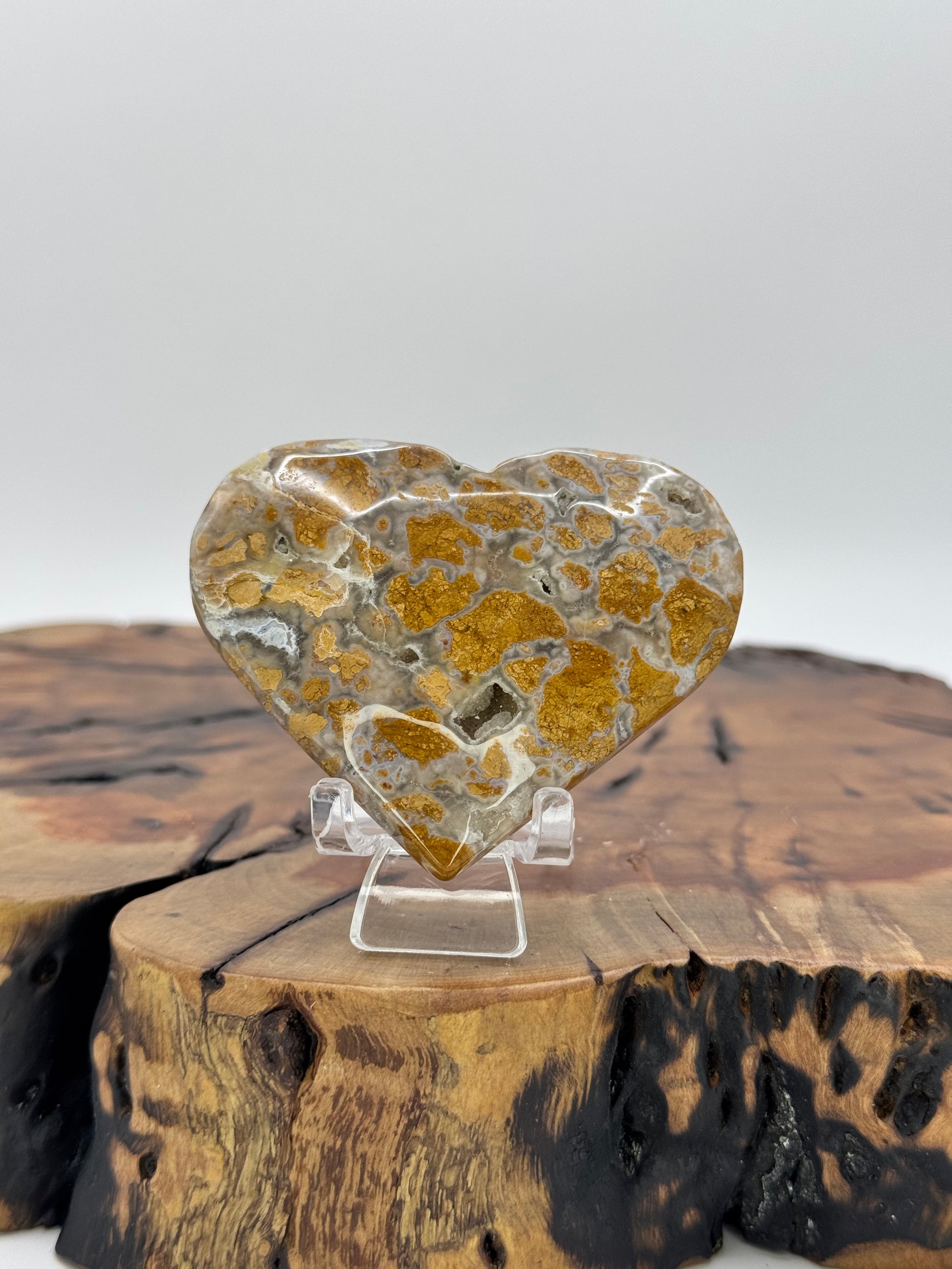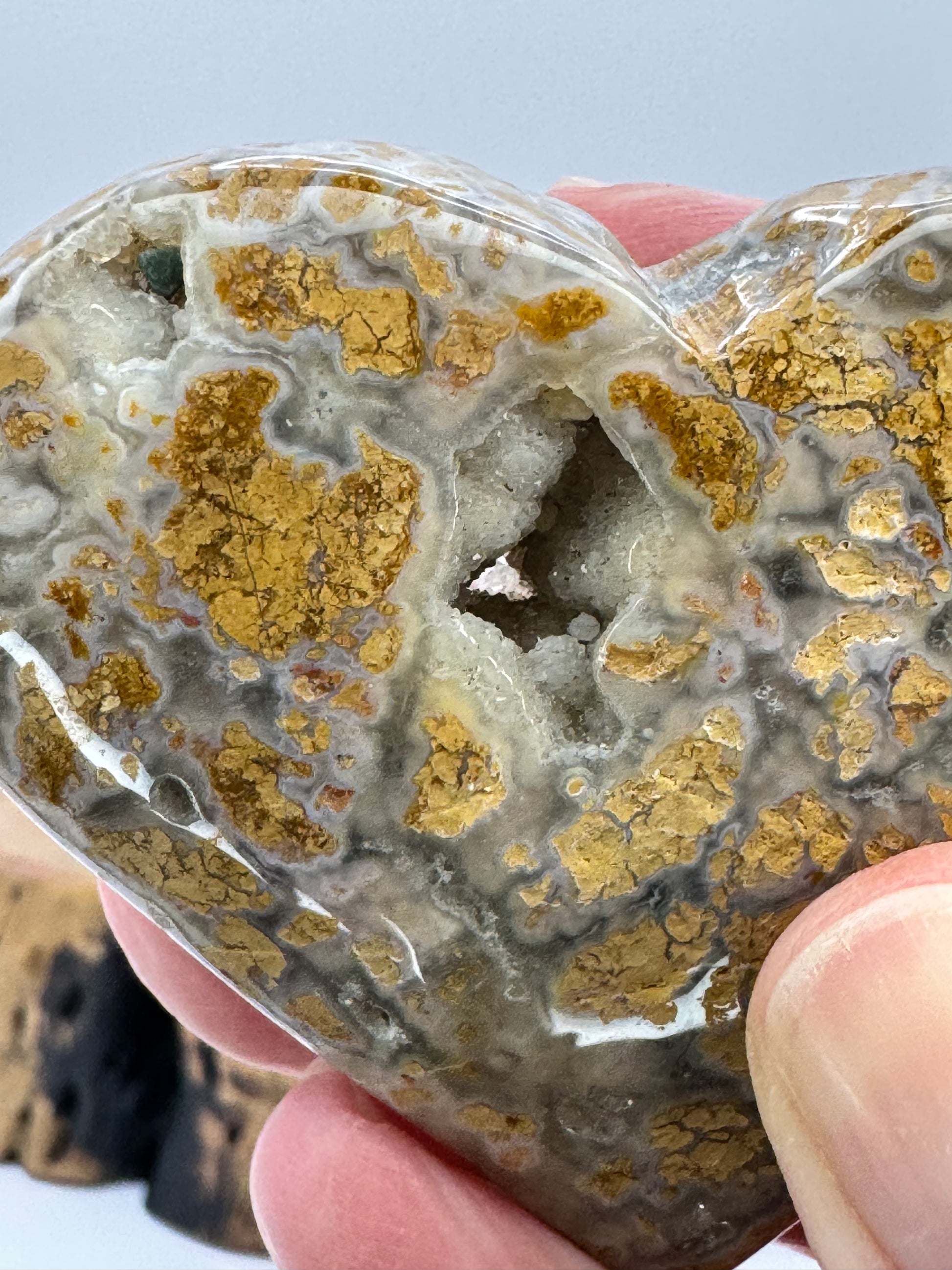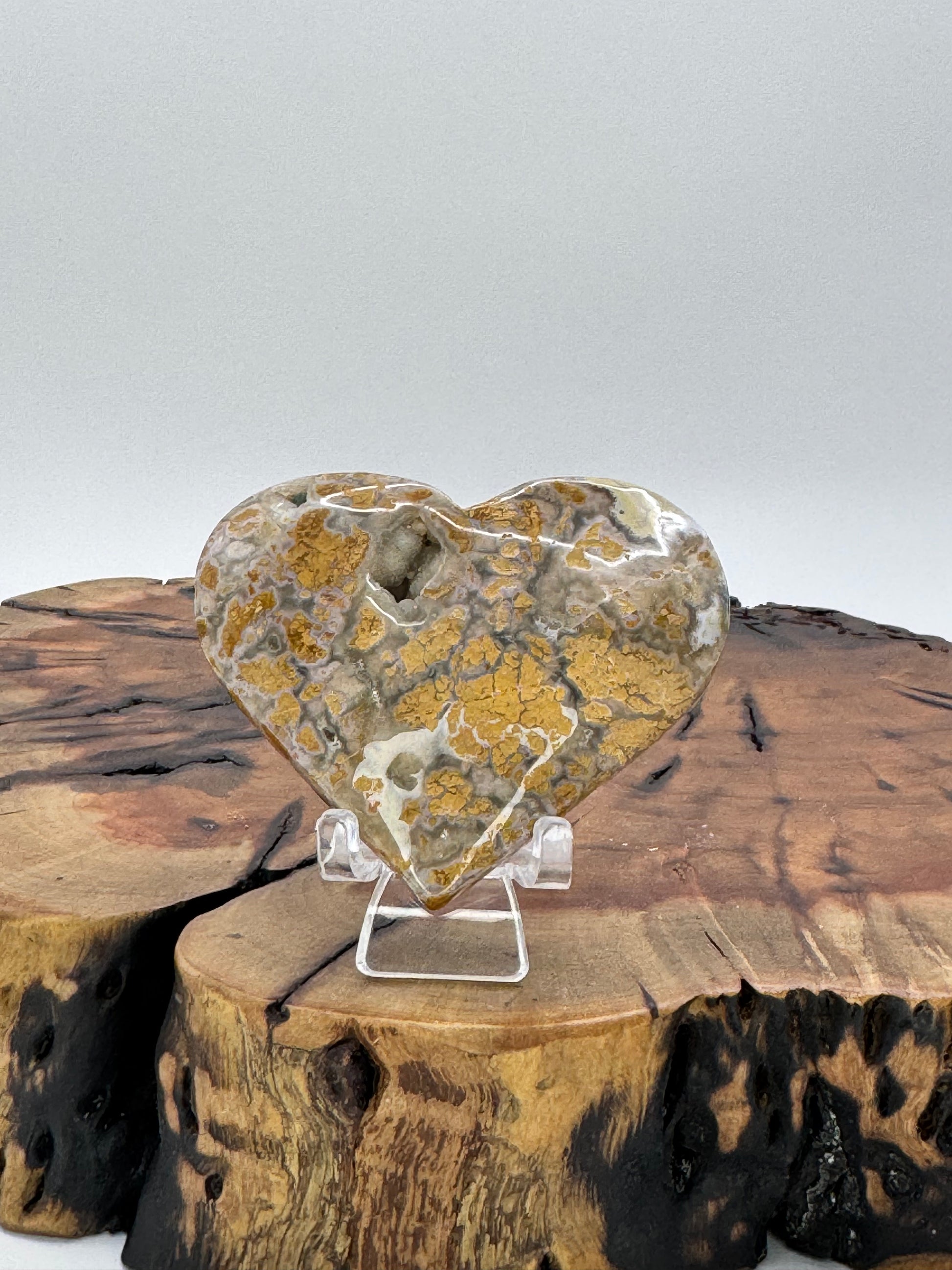 Indulge in the splendor of natural beauty with our Mosaic Jasper Heart with Druzy. This exquisite piece features rich, earthy tones of jasper expertly crafted into a delicate heart shape and adorned with a shimmering druzy stone. Perfect for adding a touch of luxury to any outfit.