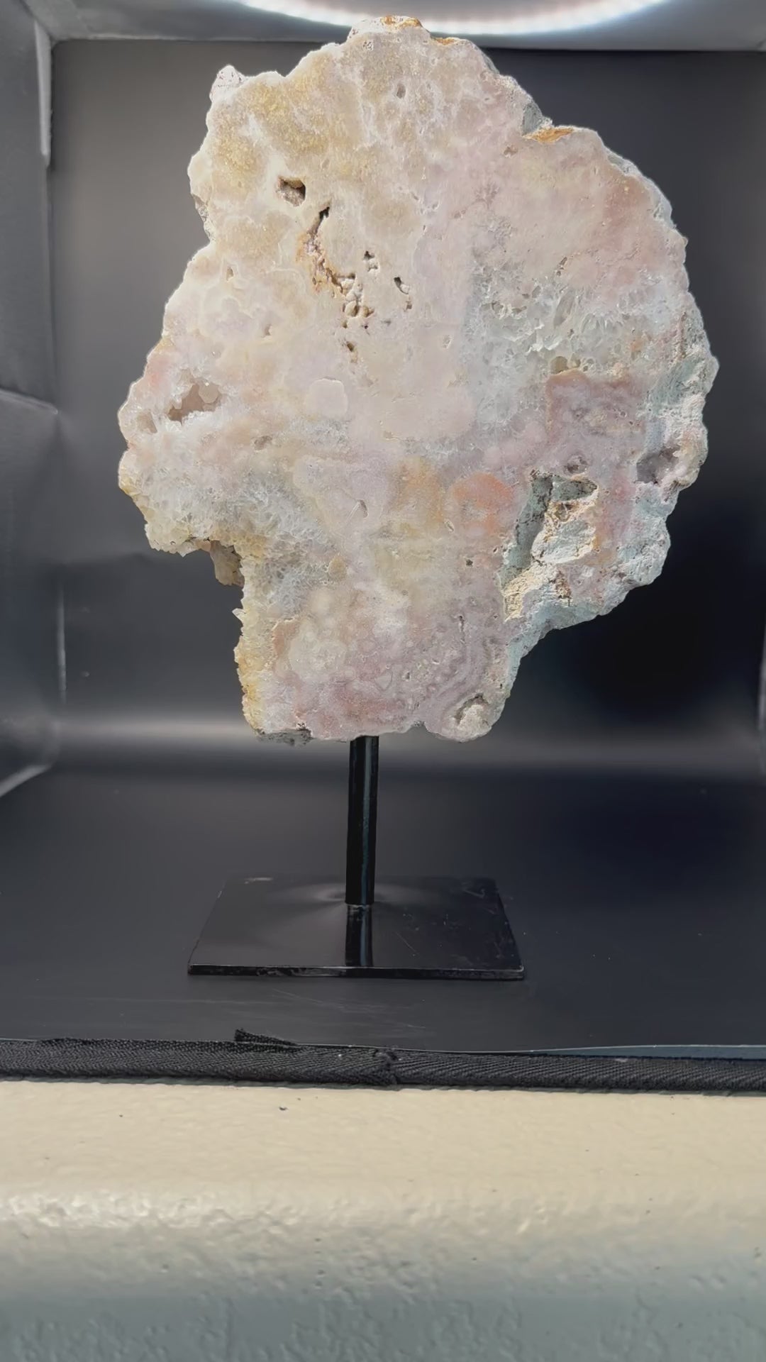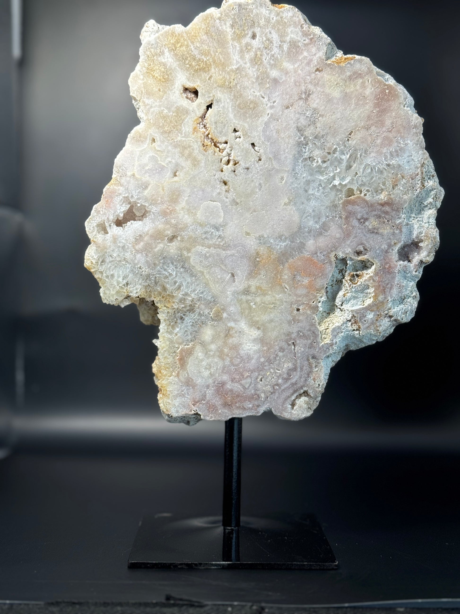 Exquisite Pink Amethyst Slab elegantly displayed on a custom stand, sourced directly from the mineral-rich regions of Brazil. This rare crystalline formation showcases a mesmerizing gradient of delicate pink hues with natural druzy formations that catch the light with sophisticated brilliance.