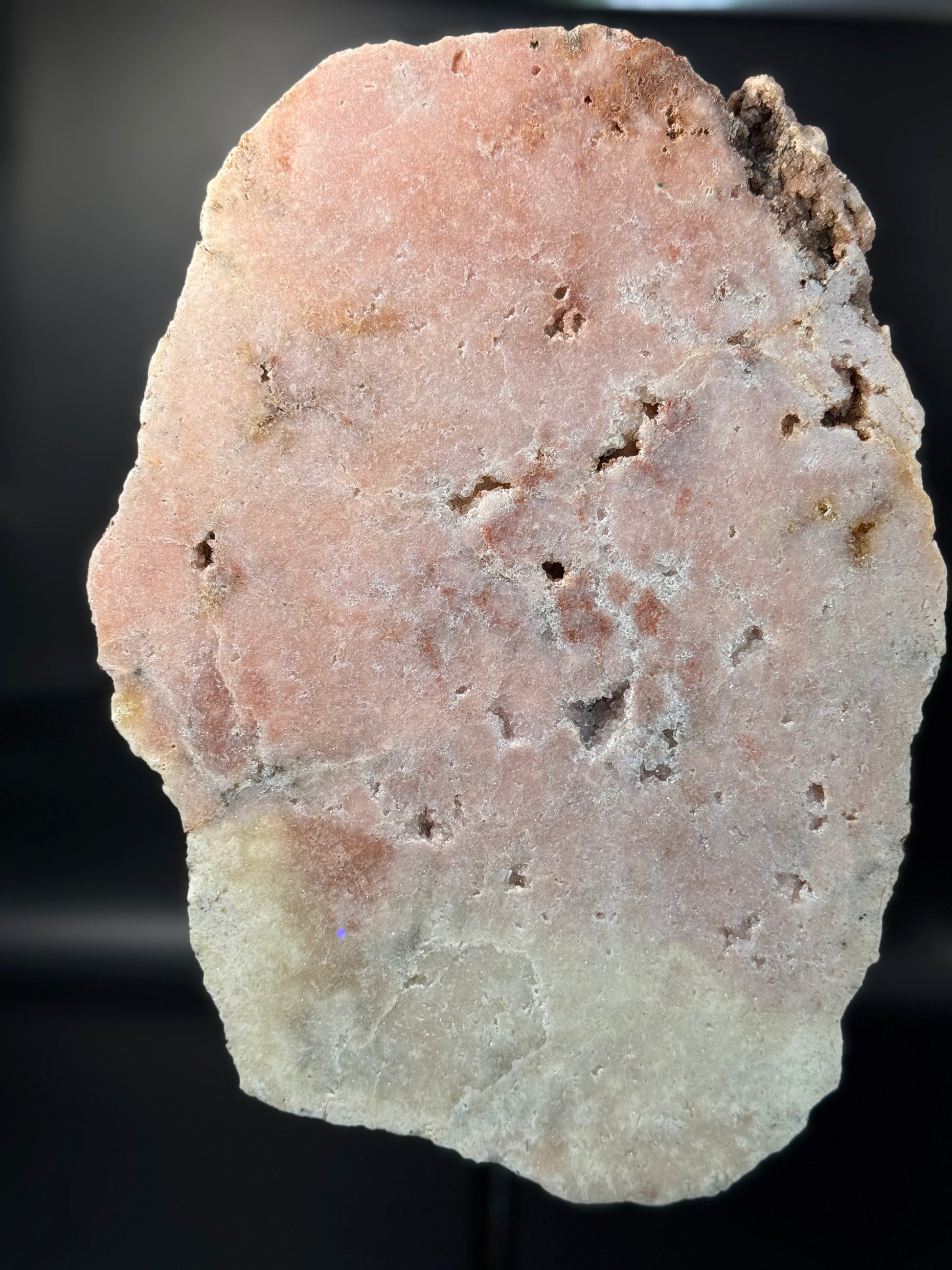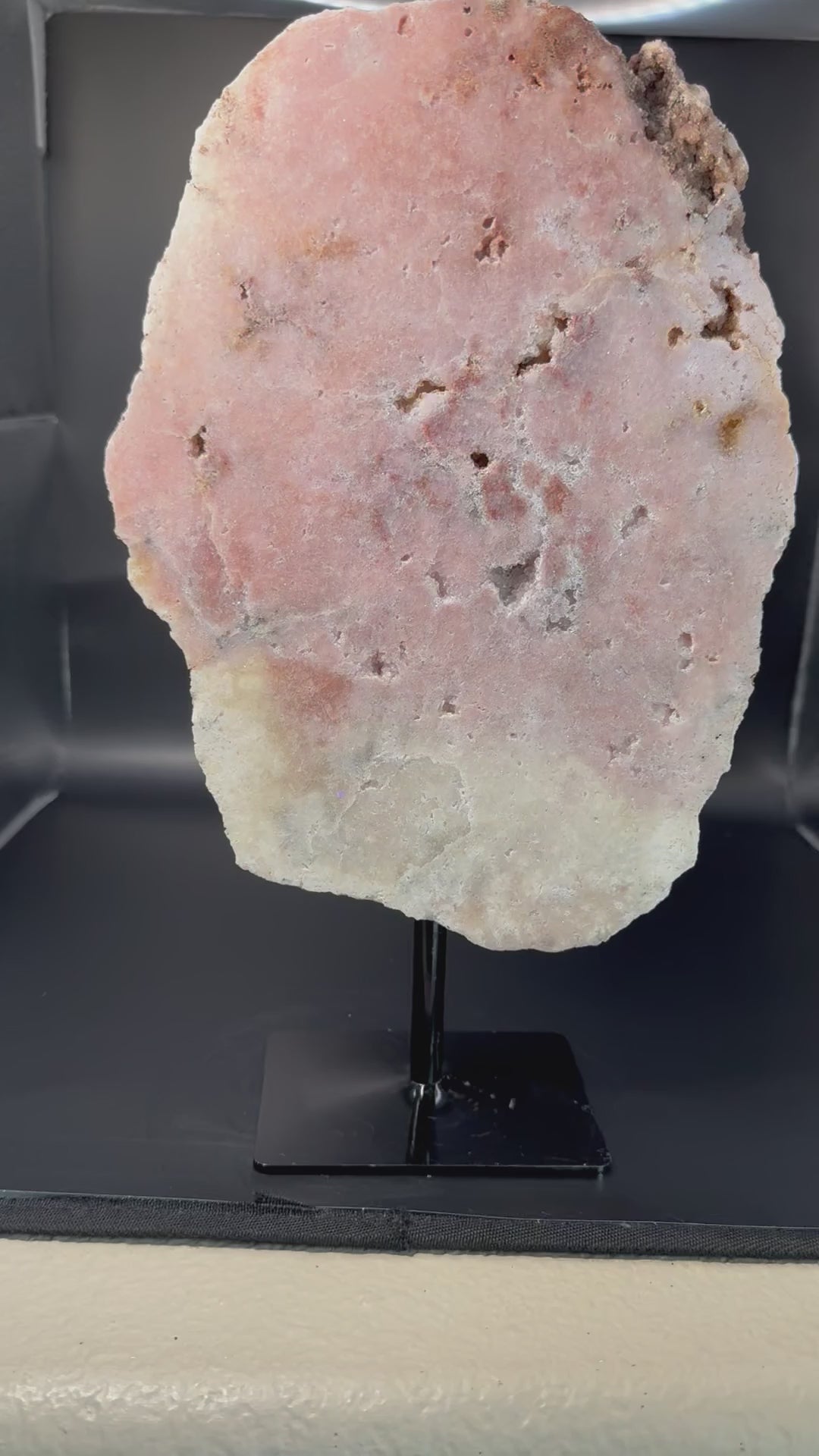 Exquisite Pink Amethyst Slab elegantly displayed on a custom stand, sourced directly from the mineral-rich regions of Brazil. This rare crystalline formation showcases a mesmerizing gradient of delicate pink hues with natural druzy formations that catch the light with sophisticated brilliance.
