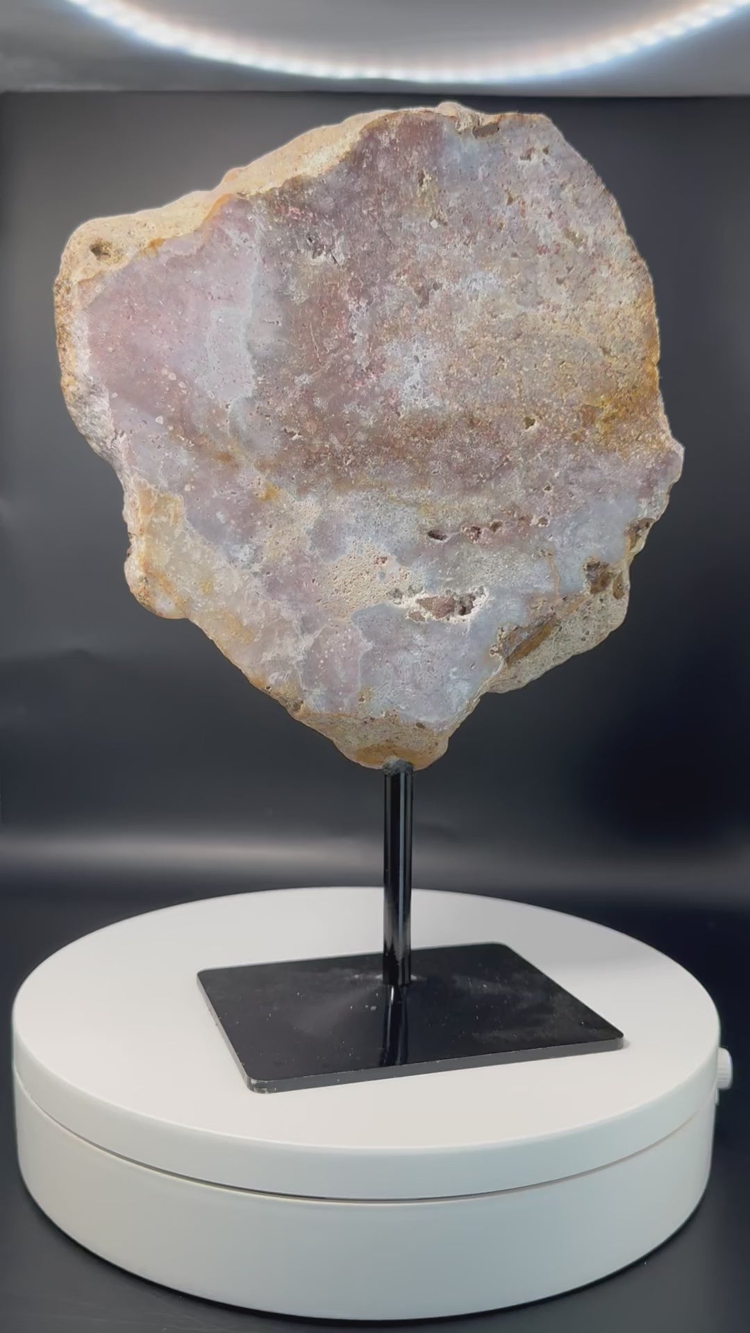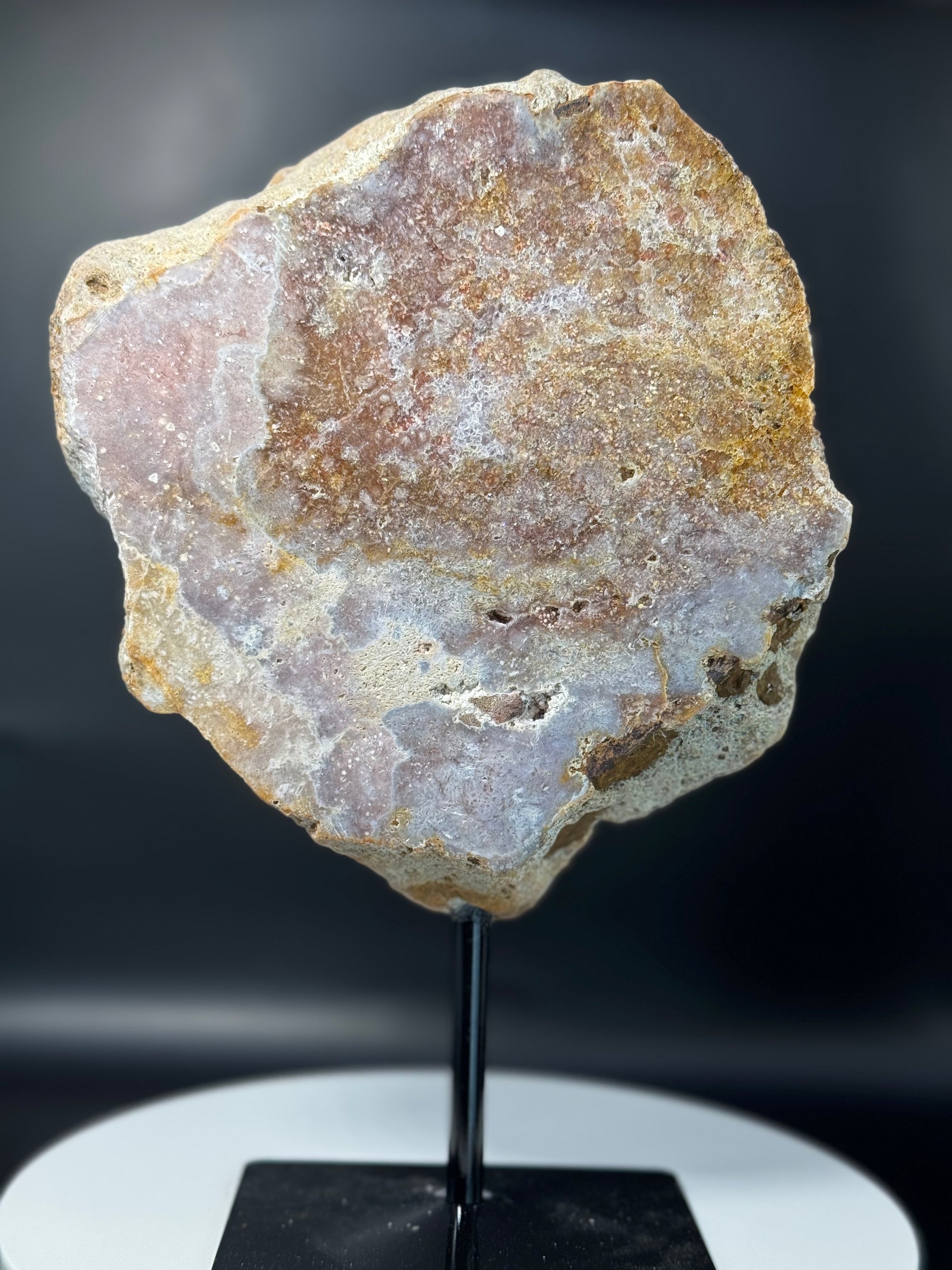 Exquisite Pink Amethyst Slab elegantly displayed on a custom stand, sourced directly from the mineral-rich regions of Brazil. This rare crystalline formation showcases a mesmerizing gradient of delicate pink hues with natural druzy formations that catch the light with sophisticated brilliance.