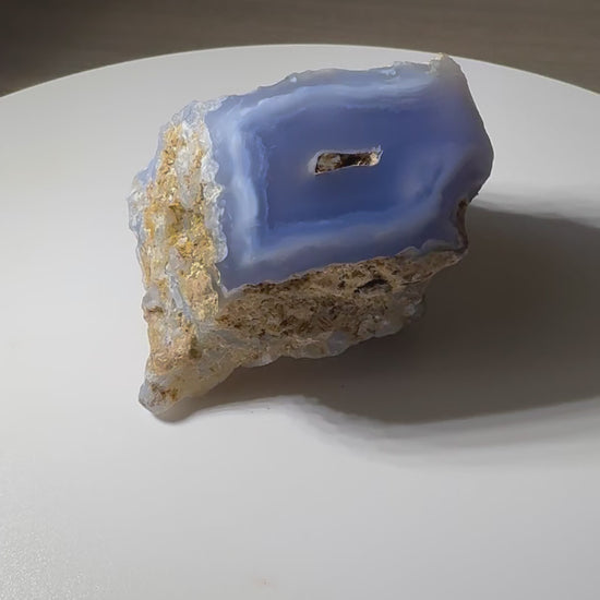 Discover the captivating beauty of the Polished Face Blue Banded Agate. Its smooth, glossy surface highlights striking blue bands that create a serene and elegant look. Perfect for collectors or as a unique decorative piece, this agate brings natural charm and calming energy to any space. Elevate your collection with this exquisite stone that combines artistry and nature’s wonder. Approximately 2 inches tall, 2 inches wide and 1.4 tall.