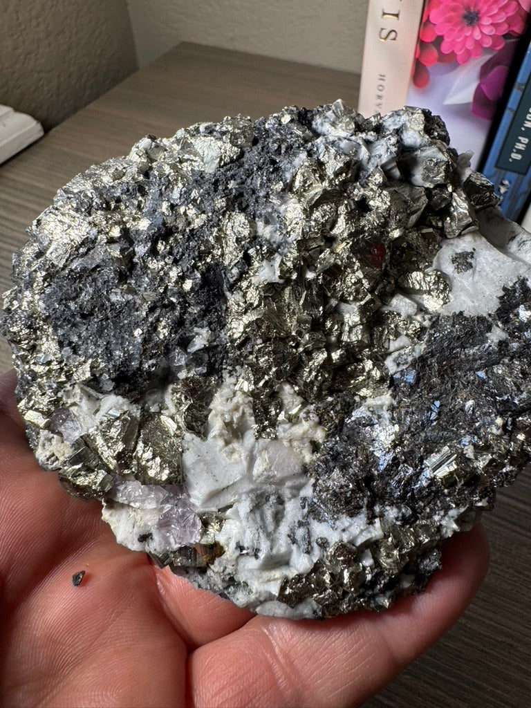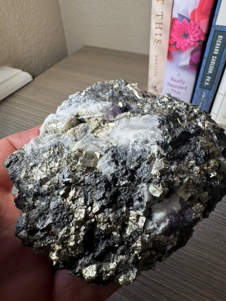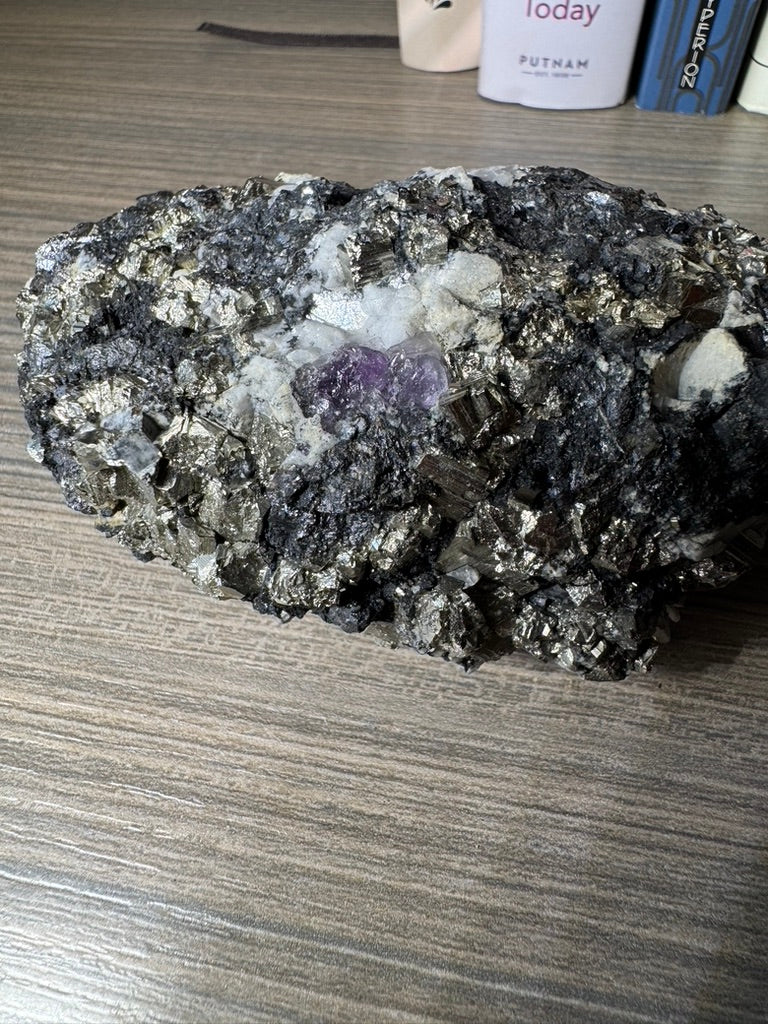 Pyrite on Fluorite from La Ojuela mine, Mapimi, Durango Mexico. 599 Grams (Golden Flame)