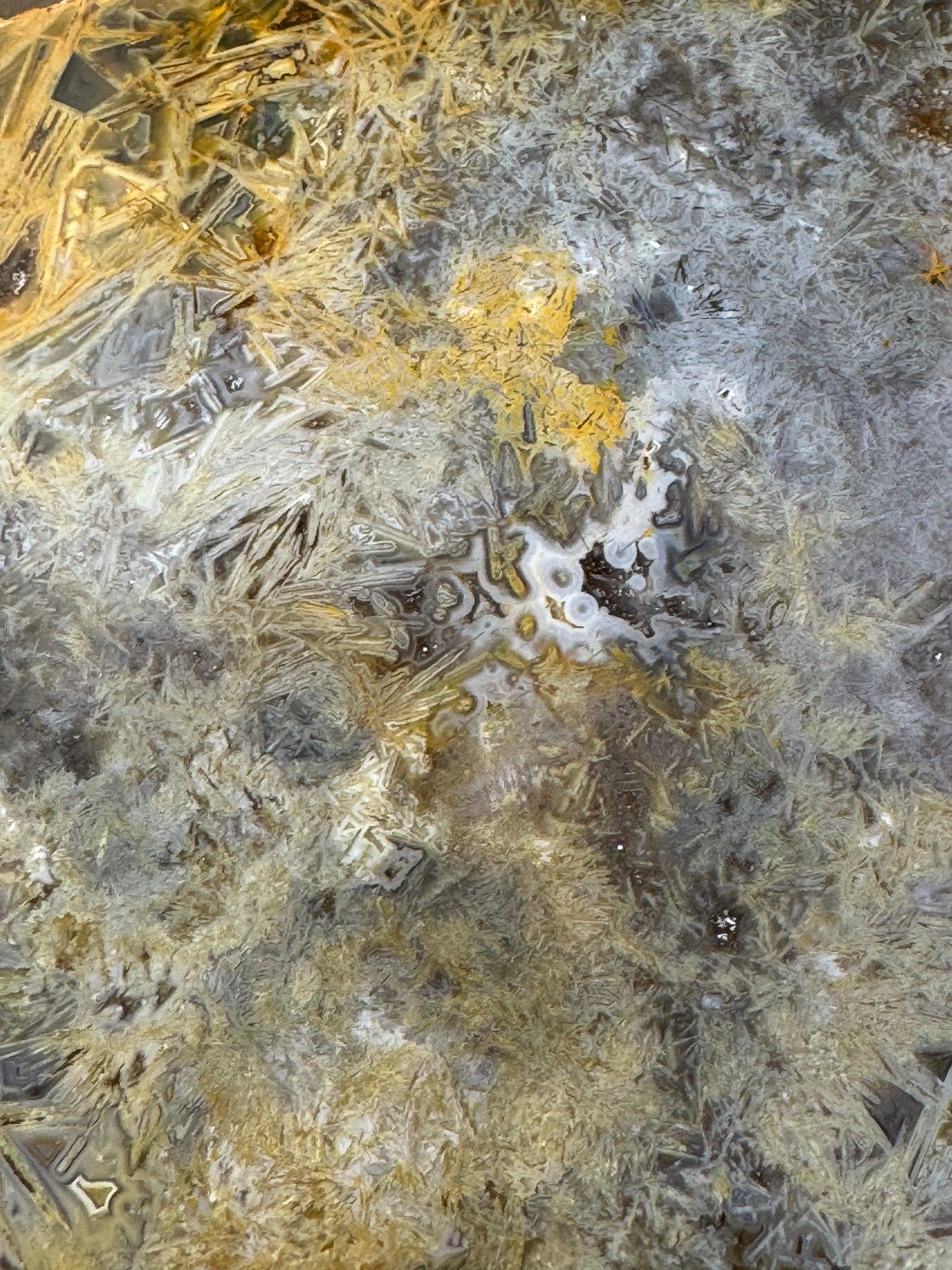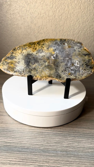 Discover the captivating beauty of this Amazing Brazilian Sagenite Agate Slab, elegantly displayed on a sturdy stand. Each unique slab showcases intricate natural patterns that bring a touch of nature’s artistry into your space. Perfect as a striking centerpiece or a thoughtful gift, this agate slab adds sophistication and a sense of tranquility to any room. Elevate your décor with a piece that combines natural wonder and timeless elegance.