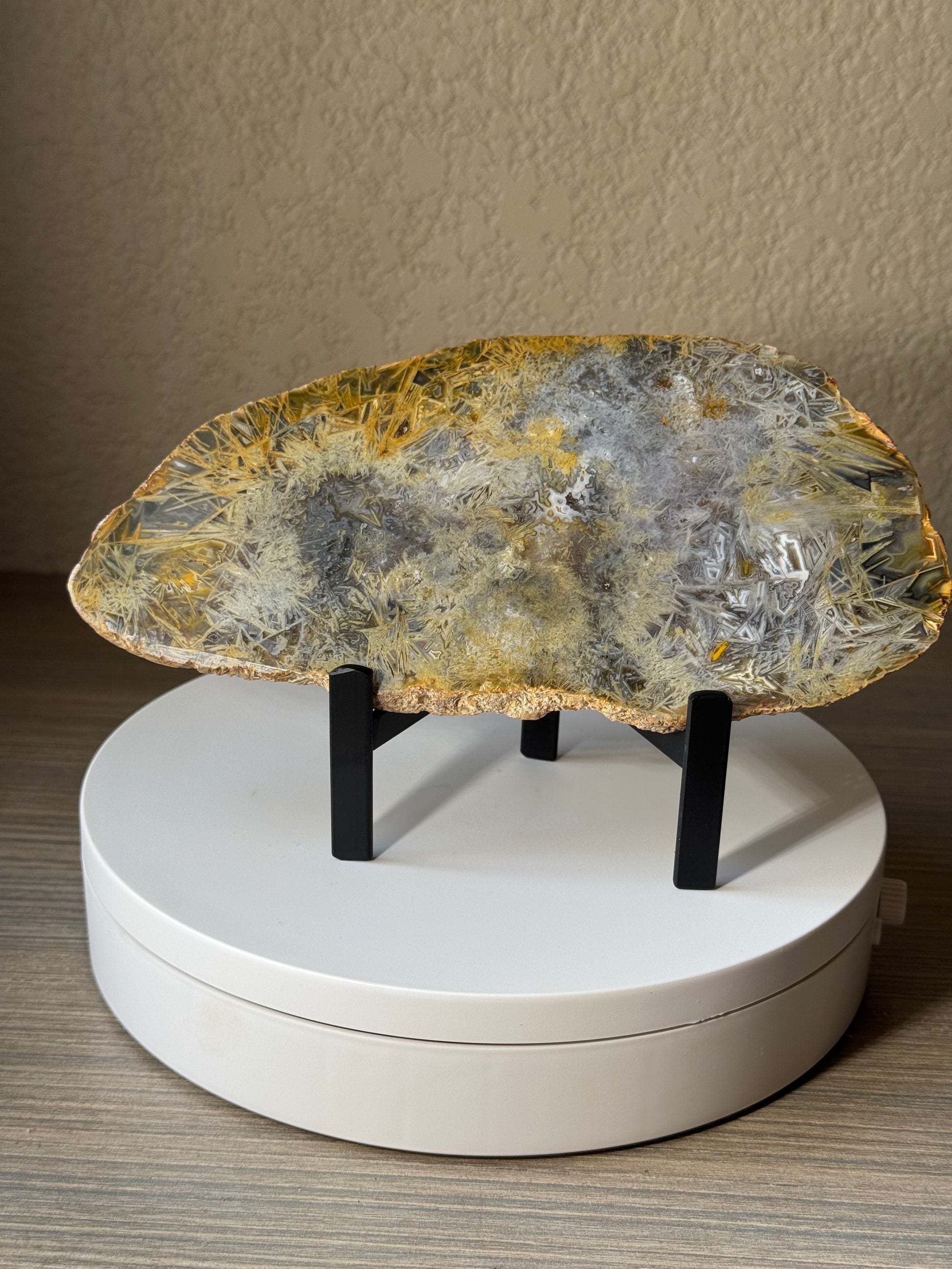 Rare High Grade Brazilian Sagenite Agate Slab on Metal Stand