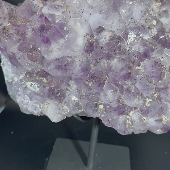 This impressive 16-pound amethyst cluster from Brazil is beautifully adorned with golden rutile, creating a striking contrast that enhances its natural allure. Perfect as a captivating centerpiece, it brings both elegance and a unique energy to any space. Its vibrant purple hues combined with shimmering golden needles make it a rare find for collectors and crystal enthusiasts seeking to elevate their environment with beauty and positive vibes.