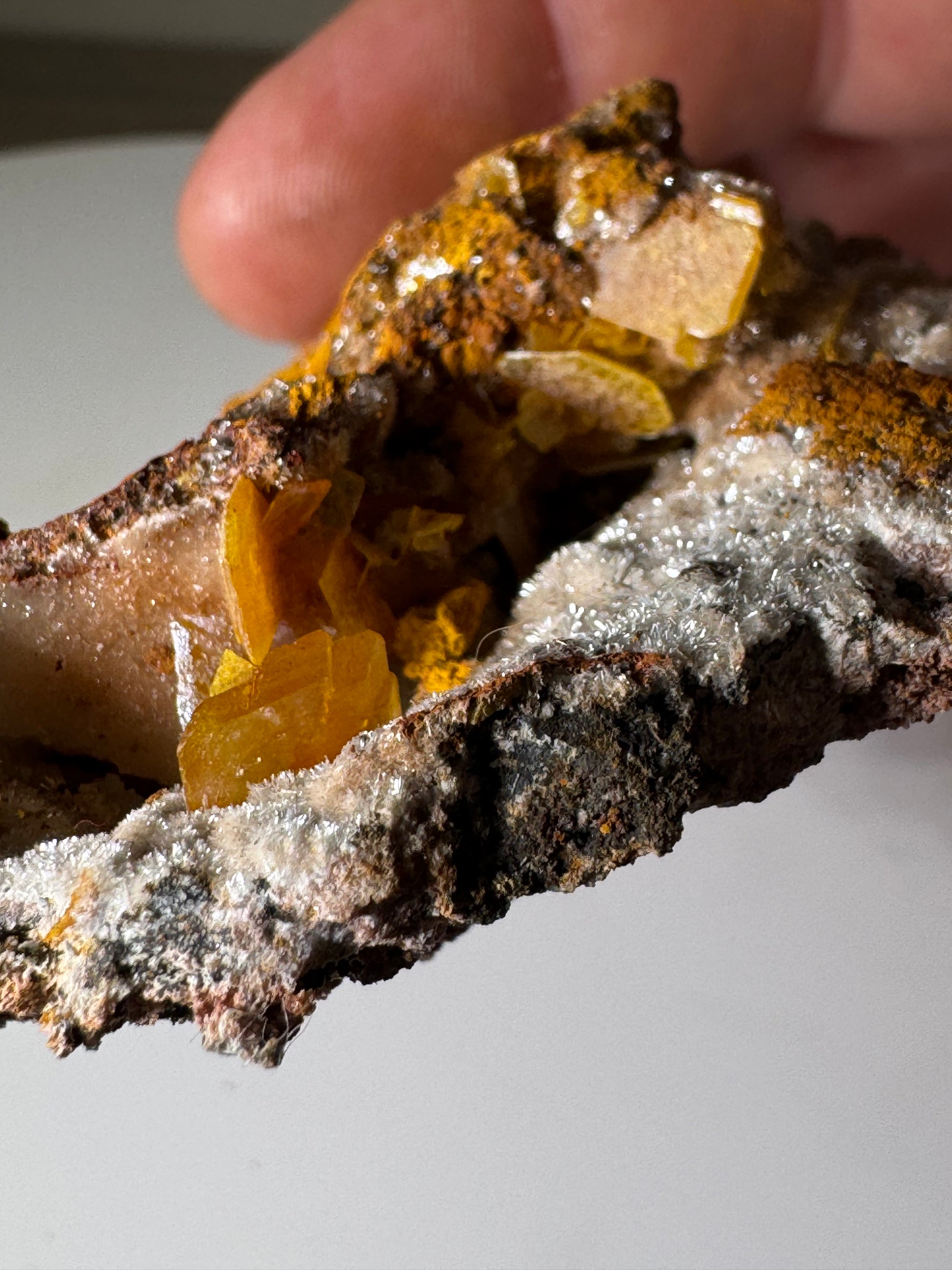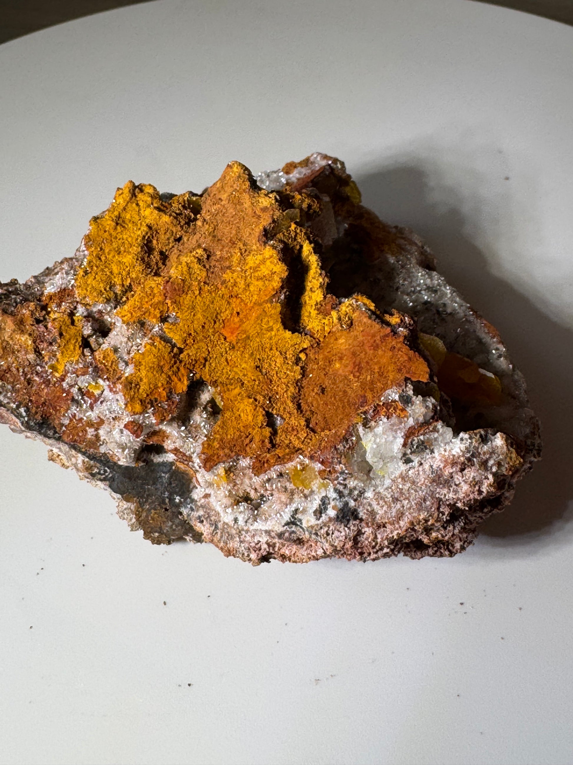 Discover the striking beauty of this 114-gram Wulfenite specimen from the renowned Los Lamentos Mine in Chihuahua, Mexico. Featuring vivid yellow blades, this mineral showcases exceptional color and crystal formation. Perfect for collectors and enthusiasts, its vibrant hue and natural structure make it a captivating display piece that brings a unique touch of nature’s artistry to your collection.